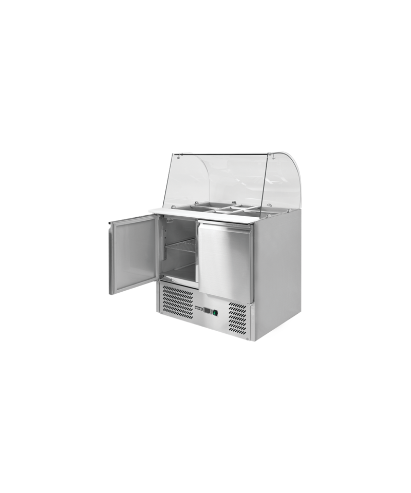 This functional refrigerated salad table with compact dimensions of 900 x 700 x 850 mm offers an impressive chamber capacity of 240 L. It is designed for optimal food storage within a precise temperature range of +2 to +80C, ensuring the freshness of ingredients.