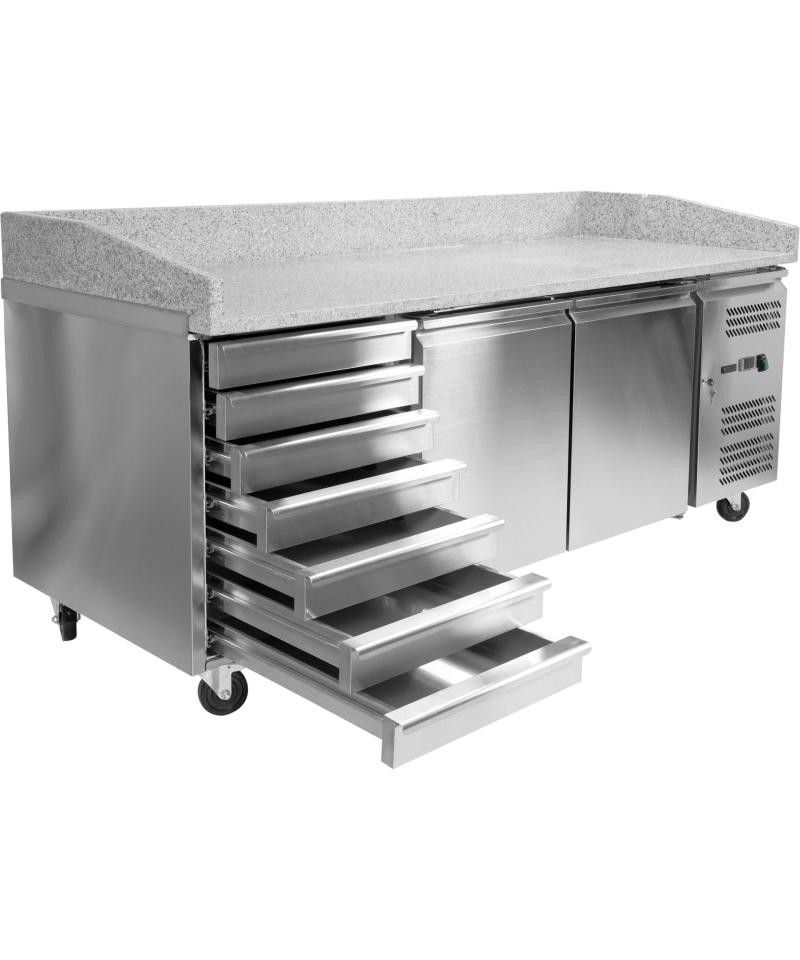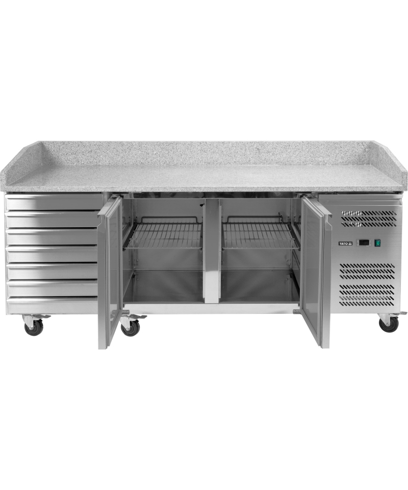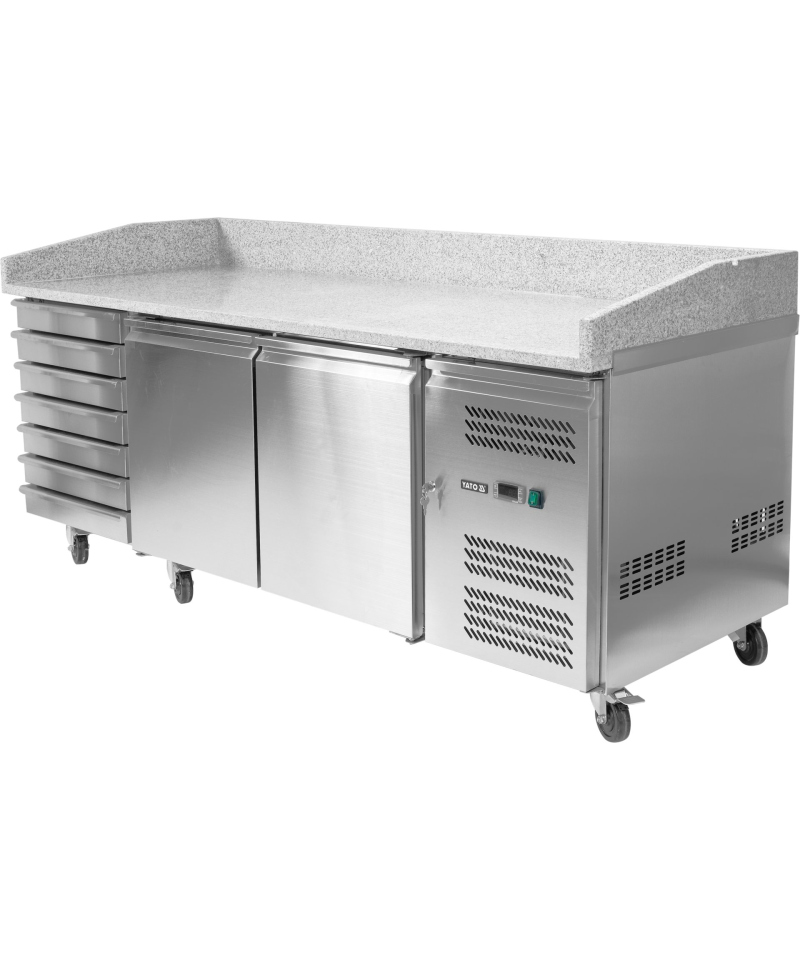 Discover the reliable YATO YG-05275 refrigerated table, equipped with two door compartments and seven practical drawers, featuring an elegant and durable granite worktop.