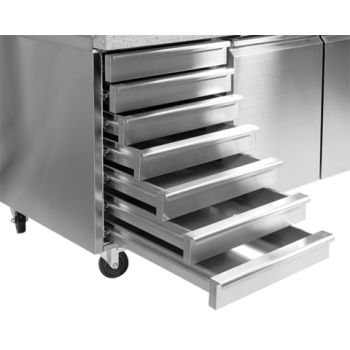 2-door pizza table with marble top, stainless top and a cutout for GN containers, evaporator packed in the back wall, forced air circulation, automatic defrosting and condensate evaporation, electronic controller. Ready to connect.