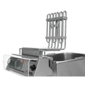 The efficient 2.0kW heater is precisely controlled by an intuitive potentiometer, located on the ergonomic control panel. This allows for smooth adjustment of the operating temperature in a wide range from 60 to 200℃. An integrated, splash-proof switch ensures safe disconnection of the device without having to remove the plug from the socket. Furthermore, the control panel is equipped with a robust protective cover made of exceptionally durable polycarbonate, effectively protecting against oil splashes during intensive frying, which significantly facilitates keeping the fryer impeccably clean. The innovative, removable heater can be hung on a special holder, allowing oil to drain freely back into the tank. The device also features an advanced safety system that automatically switches off the heater if it is removed from the tank, and also protects against overheating, activating at temperatures above 260℃.