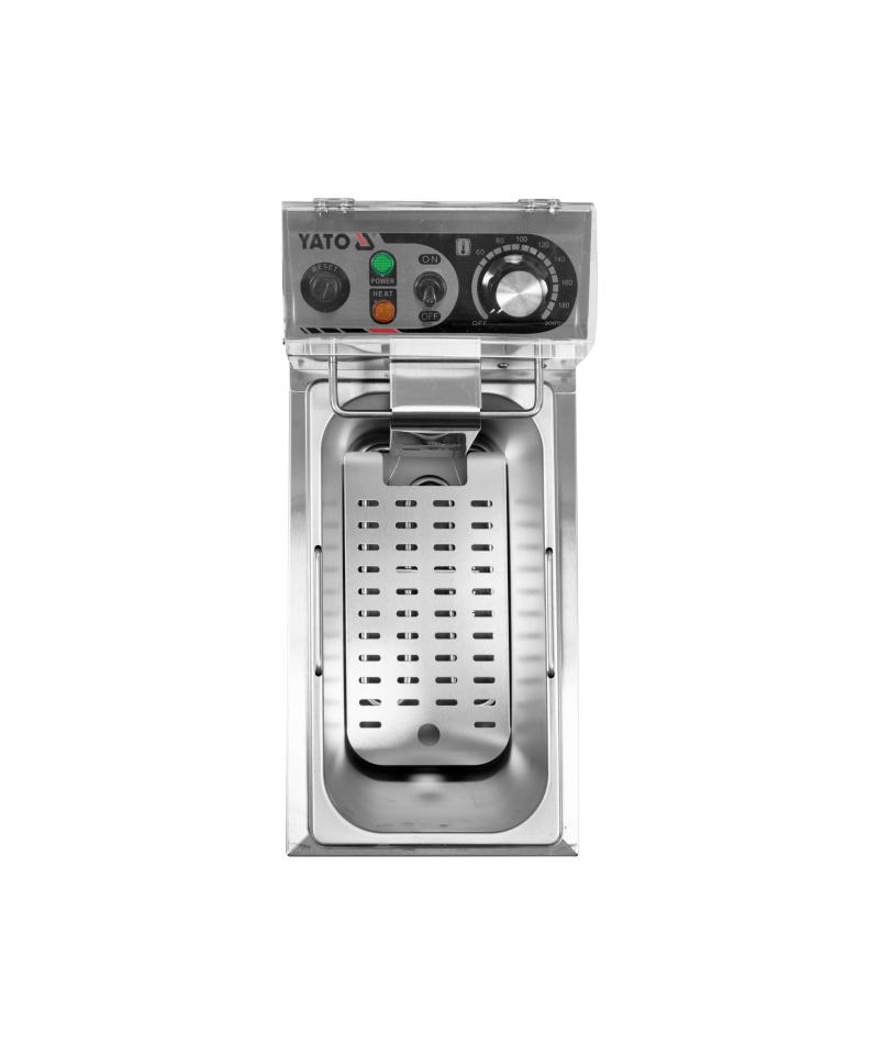 The YATO fryer is equipped with an extremely durable basket measuring 200x135x140mm, with an ergonomic, plastic, non-heating handle, ensuring comfort and safety of use. Specially designed hooks allow for convenient hanging of the basket directly above the tank, which effectively minimizes the risk of oil splashing onto the worktop. This solution significantly contributes to maintaining cleanliness at the workstation and reduces the time spent on cleaning.