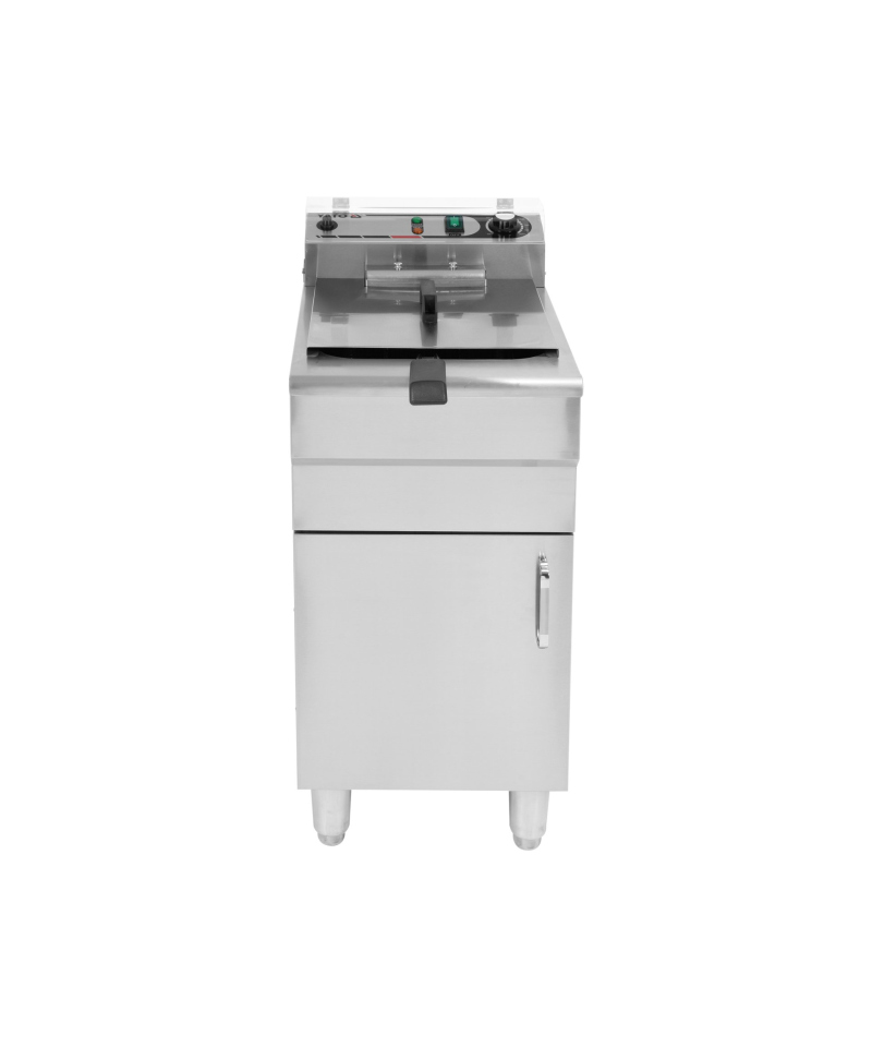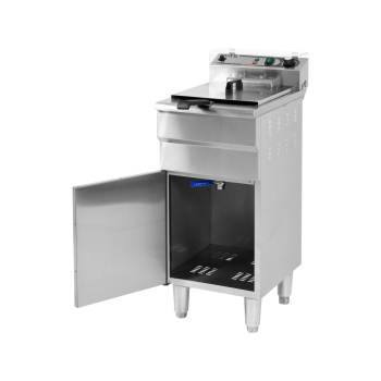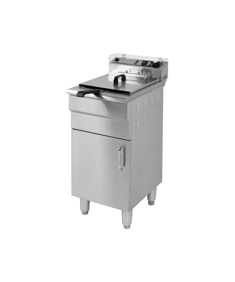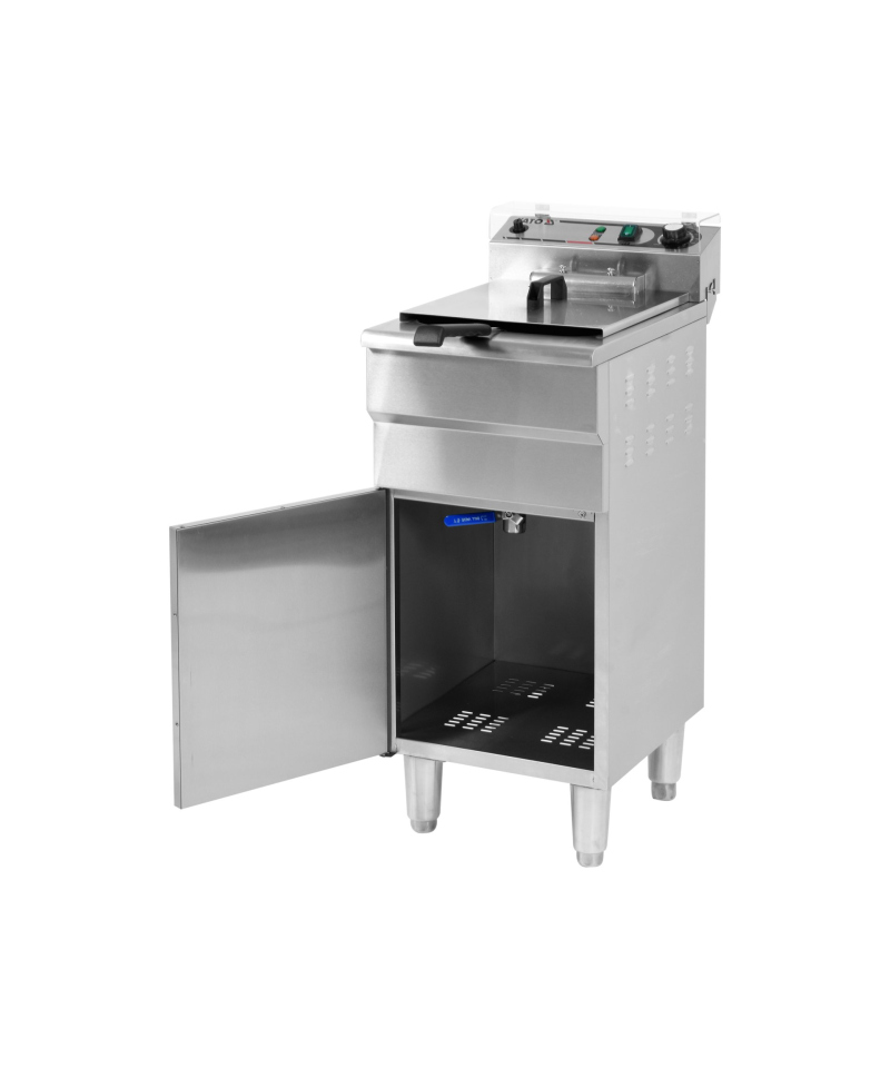 This freestanding fryer has been intelligently designed with ergonomics in mind, offering a practical cabinet underneath, measuring 370x315x390mm, equipped with lockable doors. Inside the cabinet, at an optimal height of 32cm, a convenient draining tap is placed, allowing for quick and hygienic emptying of oil from the tank. This feature is extremely valuable as it significantly speeds up the oil change process and allows for direct draining into a canister, minimizing the risk of spillage and maintaining a clean workspace. The cabinet rests on sturdy, four legs with precise height adjustment ranging from 13.5~16cm.