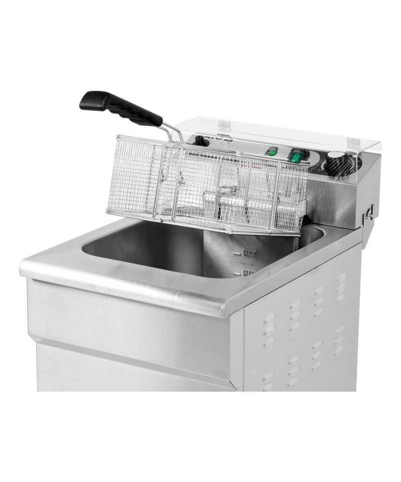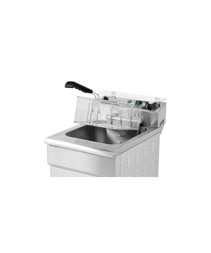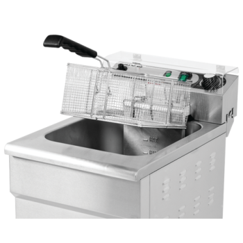 The heater, with an impressive power of 5.0kW, is precisely controlled by an intuitive potentiometer integrated into the control panel. This allows for smooth temperature regulation within a wide range from 60 to 200℃. The installed splash-proof switch ensures convenient and safe disconnection of the device without the need to unplug it from the socket. Furthermore, the control panel is equipped with a robust protective cover made of exceptionally durable polycarbonate, effectively protecting against oil splashes during intensive use, which significantly facilitates keeping the fryer impeccably clean. The innovative, removable heater can be hung on special holders, allowing oil to drain freely back into the tank. The device also features an advanced safety system that automatically switches off the heater if it is removed from the tank, protecting it from overheating at temperatures exceeding 260℃.