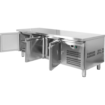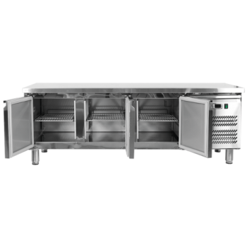 refrigerated table for GN 1/1, 4 drawers with a usable height of 152 mm, top bent upwards to 50 mm (type C), evaporator packed in the rear wall, forced air circulation, automatic defrosting and condensate evaporation, electronic controller. Ready to connect.
