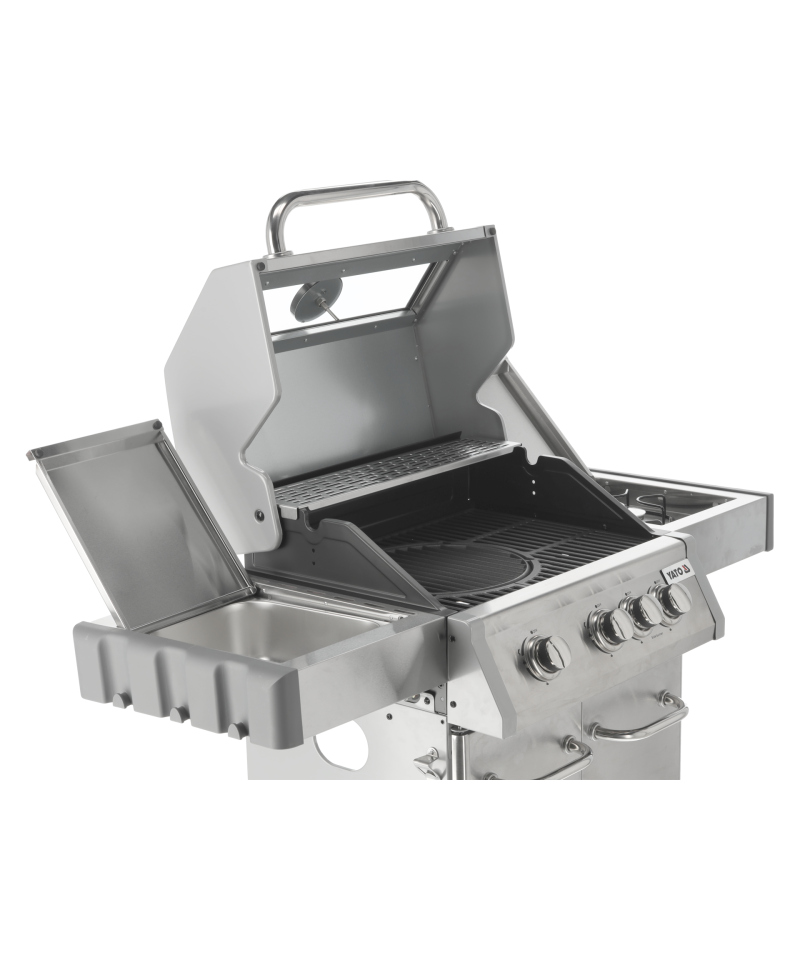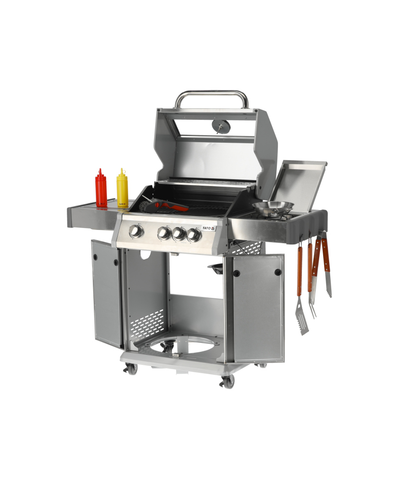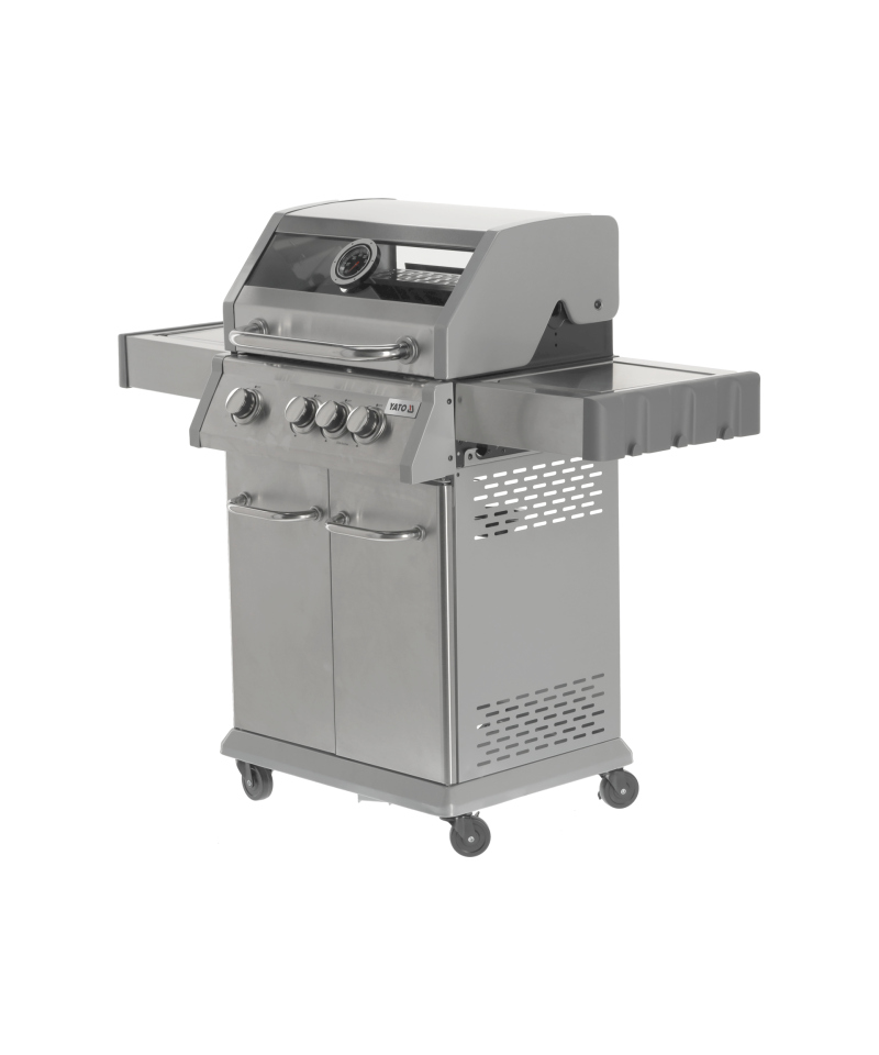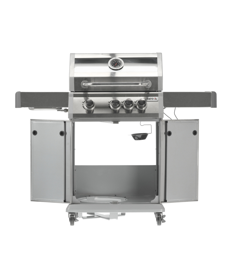 Discover the Yato Itami 3+1 gas grill, which combines modern design with the reliability of stainless steel. Equipped with a sturdy cast iron grate with an impressive surface area of 60 x 41.5 cm, it guarantees excellent grilling results. Practical side shelves and a spacious, lockable cabinet provide convenient storage for all necessary accessories. An additional 2.2 kW side burner expands culinary possibilities, allowing you to cook and heat dishes in a pot or pan. User comfort is enhanced by amenities such as a dedicated space for a gas cylinder, a functional stainless steel container integrated into one of the side shelves, and a built-in bottle opener.