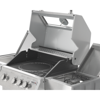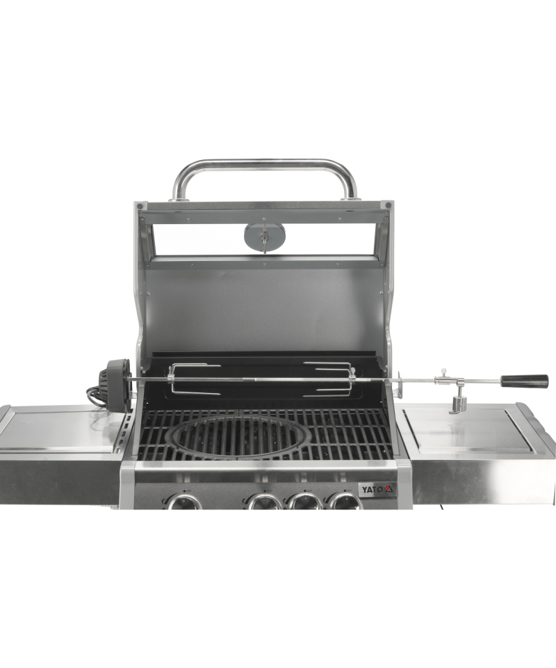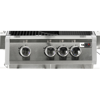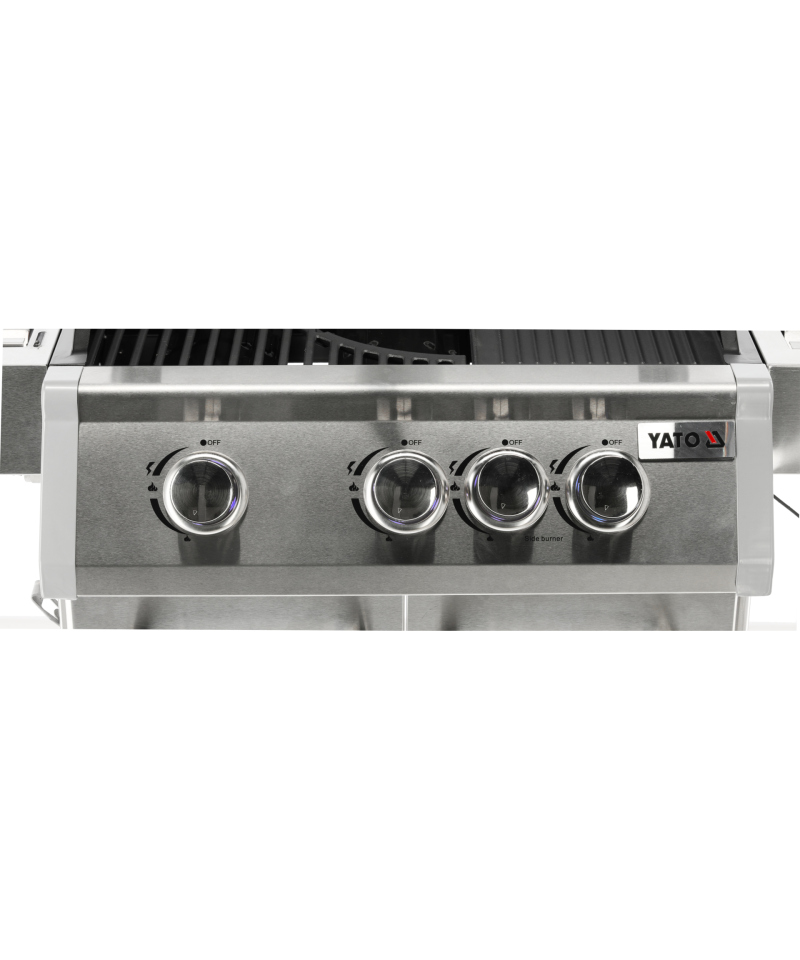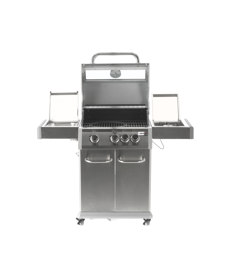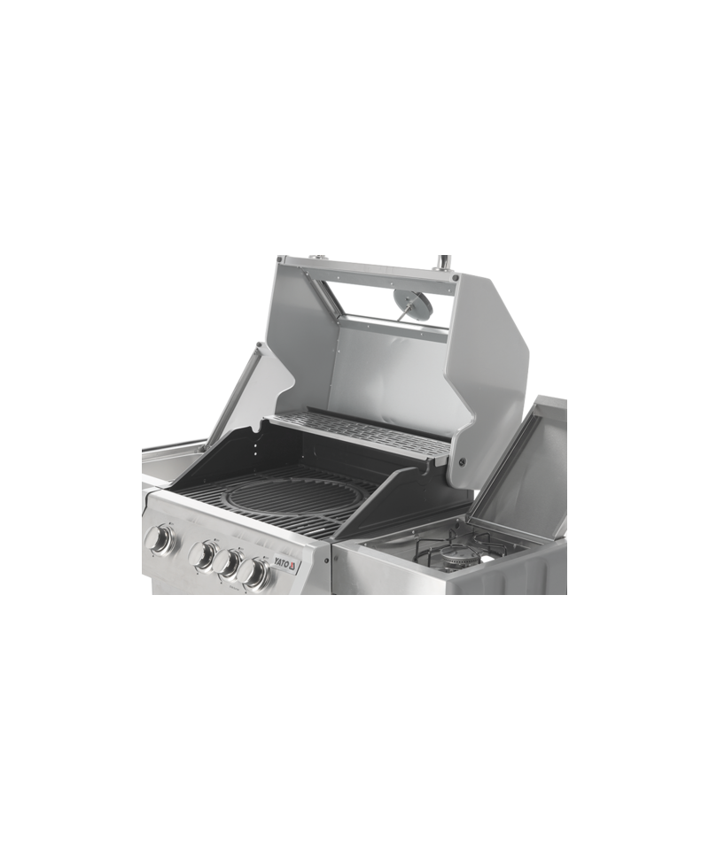 Discover the Yato Itami 3+1 gas grill, which combines modern design with the reliability of stainless steel. Equipped with a sturdy cast iron grate with an impressive surface area of 60 x 41.5 cm, it guarantees excellent grilling results. Practical side shelves and a spacious, lockable cabinet provide convenient storage for all necessary accessories. An additional 2.2 kW side burner expands culinary possibilities, allowing you to cook and heat dishes in a pot or pan. User comfort is enhanced by amenities such as a dedicated space for a gas cylinder, a functional stainless steel container integrated into one of the side shelves, and a built-in bottle opener.