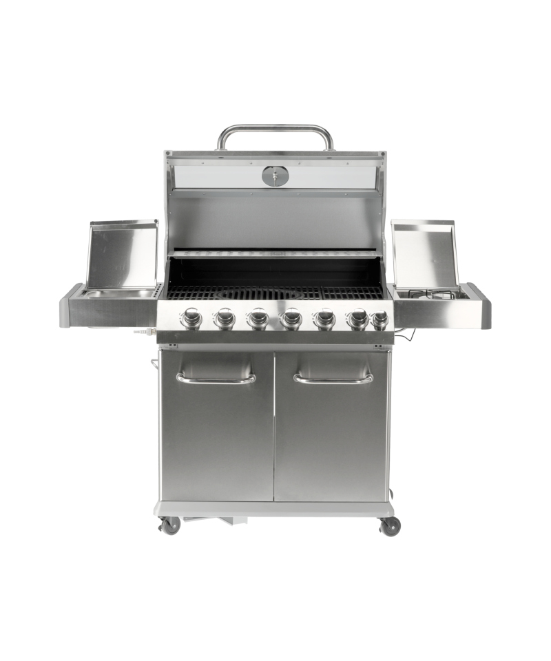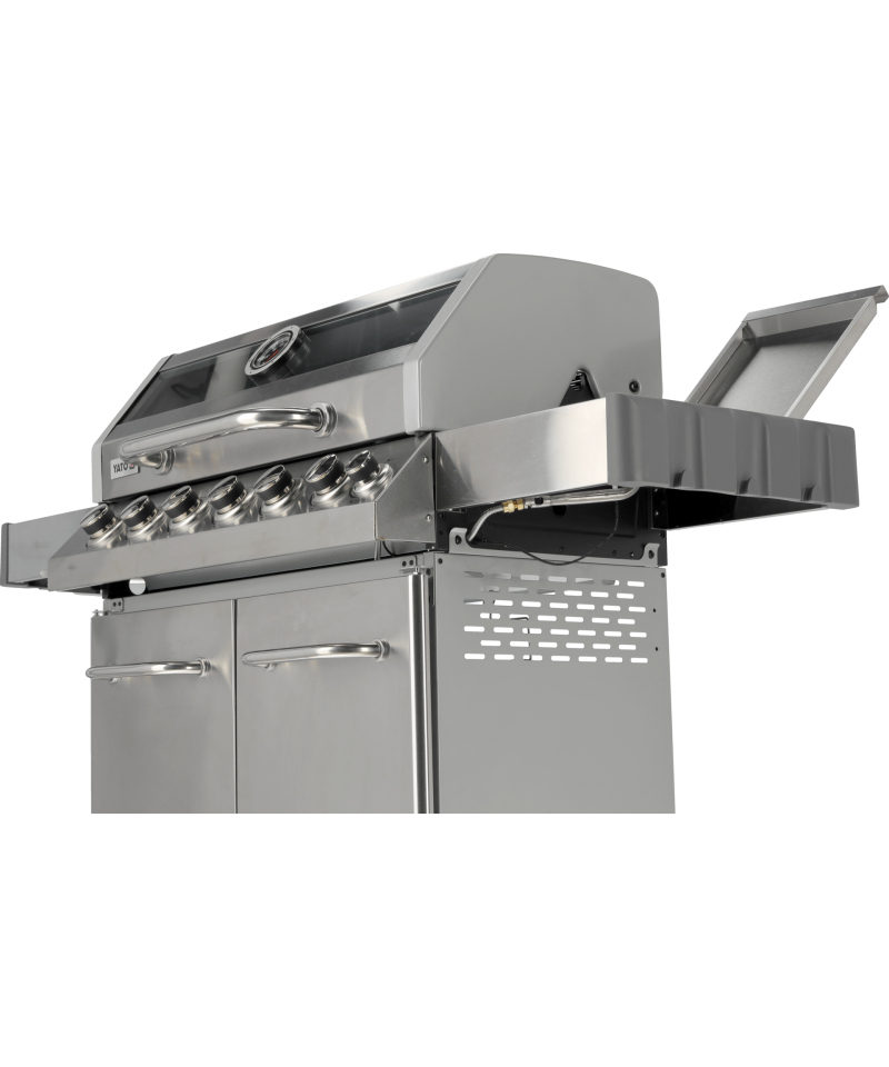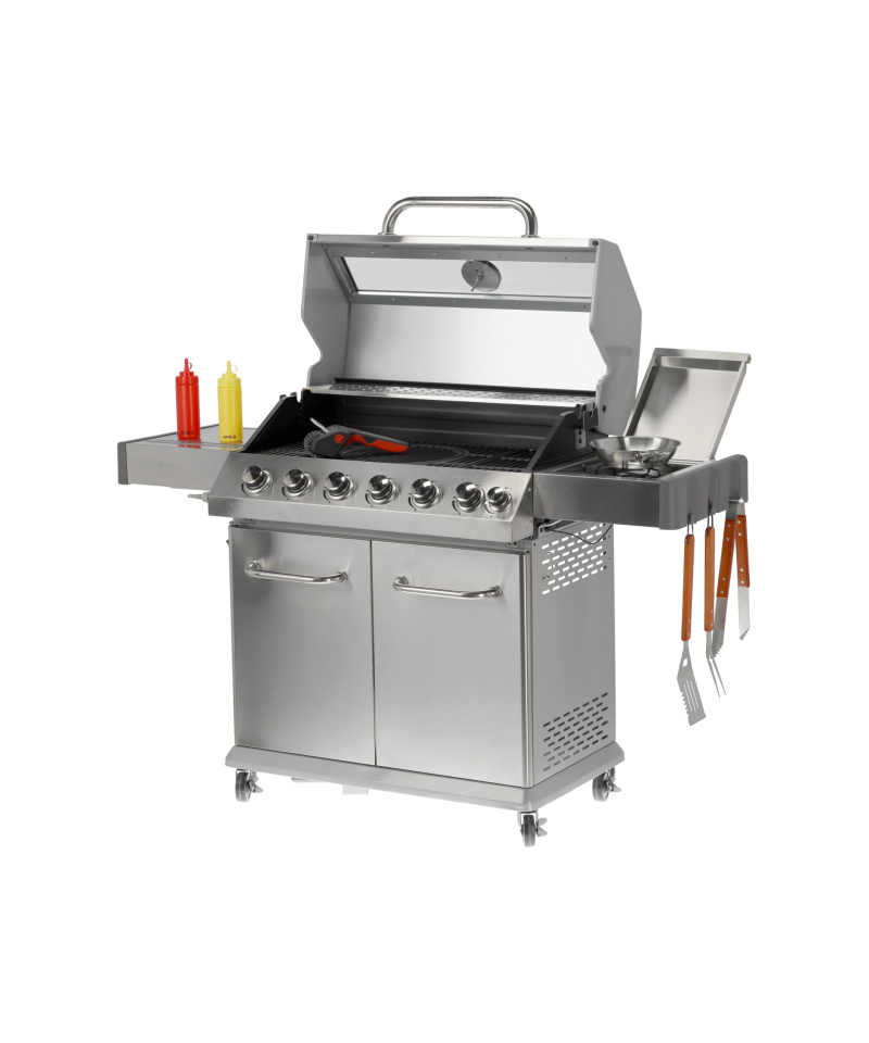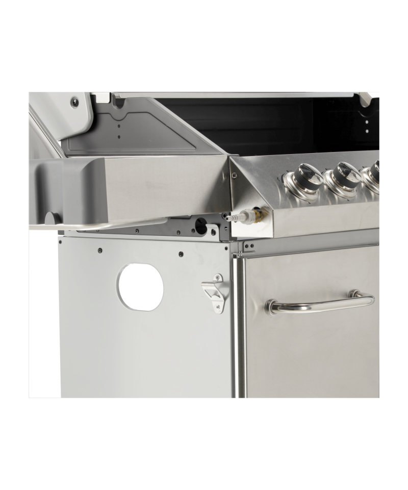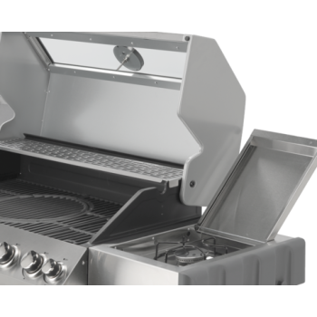 This modern 6+1 gas grill, made of high-quality stainless steel, is the epitome of functionality and style. Equipped with a solid cast iron grate with impressive dimensions of 82 x 41.5 cm, it provides excellent conditions for grilling. Practical side shelves and a spacious, lockable cabinet offer convenient storage for spices and all necessary accessories. The side burner with a power of 2.2 kW expands culinary possibilities, allowing you to cook and heat dishes in a pot or pan. User comfort is enhanced by a dedicated space for a gas cylinder, an elegant stainless steel container integrated with one of the side shelves, and a built-in bottle opener, always at hand.
