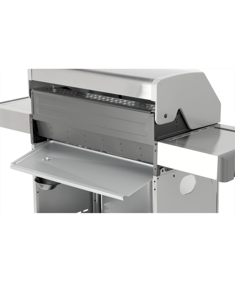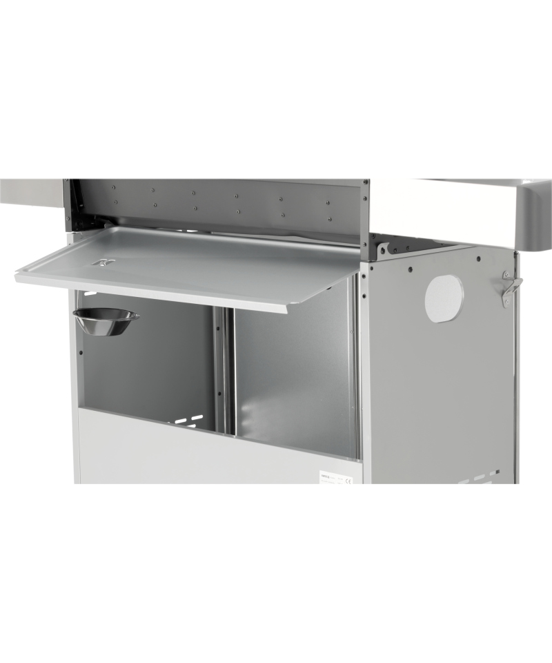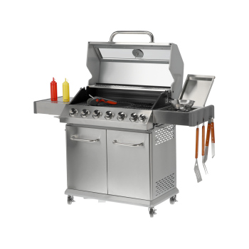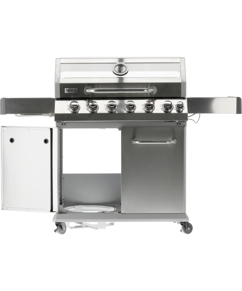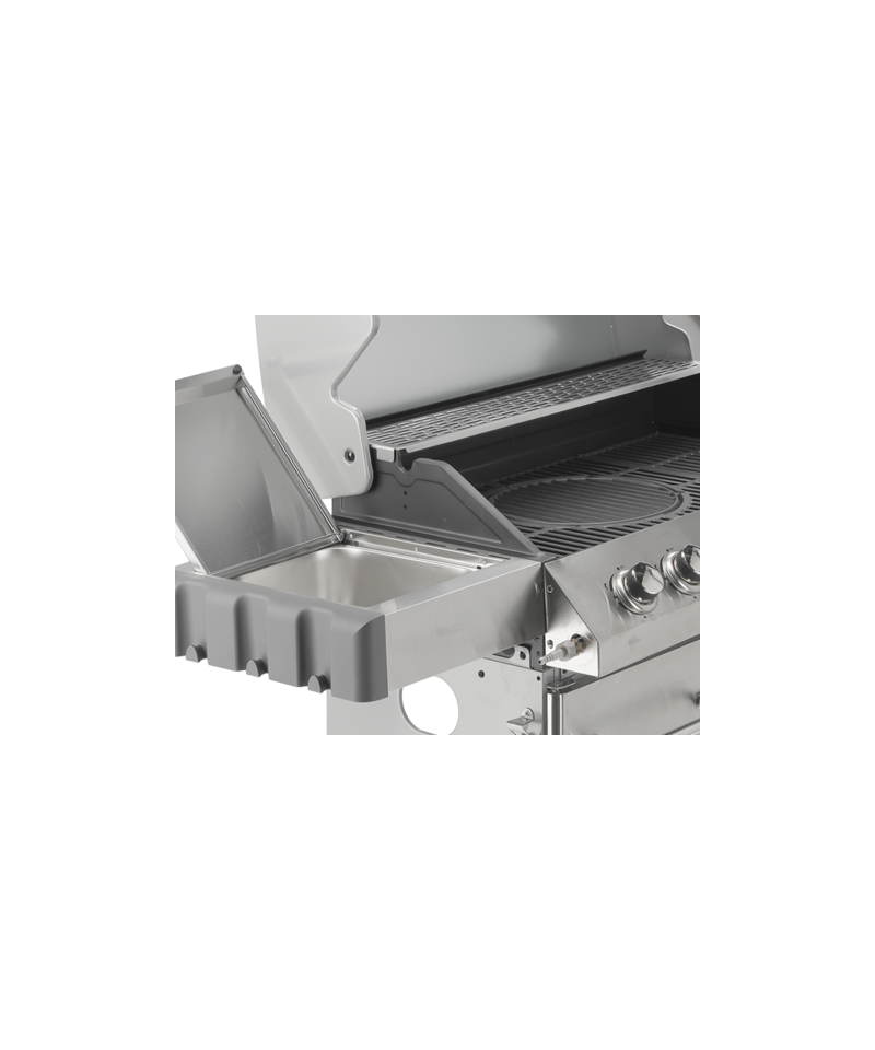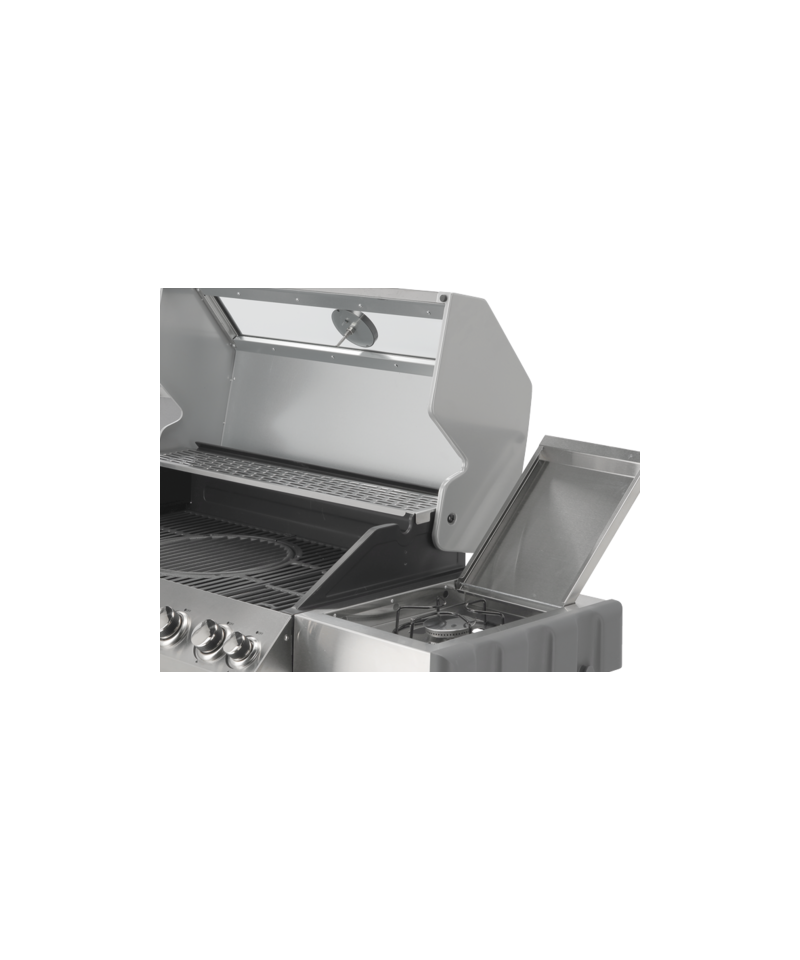 This modern 6+1 gas grill, made of high-quality stainless steel, is the epitome of functionality and style. Equipped with a solid cast iron grate with impressive dimensions of 82 x 41.5 cm, it provides excellent conditions for grilling. Practical side shelves and a spacious, lockable cabinet offer convenient storage for spices and all necessary accessories. The side burner with a power of 2.2 kW expands culinary possibilities, allowing you to cook and heat dishes in a pot or pan. User comfort is enhanced by a dedicated space for a gas cylinder, an elegant stainless steel container integrated with one of the side shelves, and a built-in bottle opener, always at hand.
