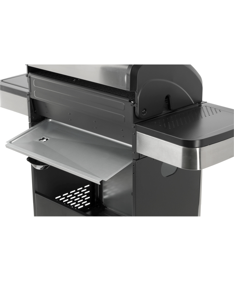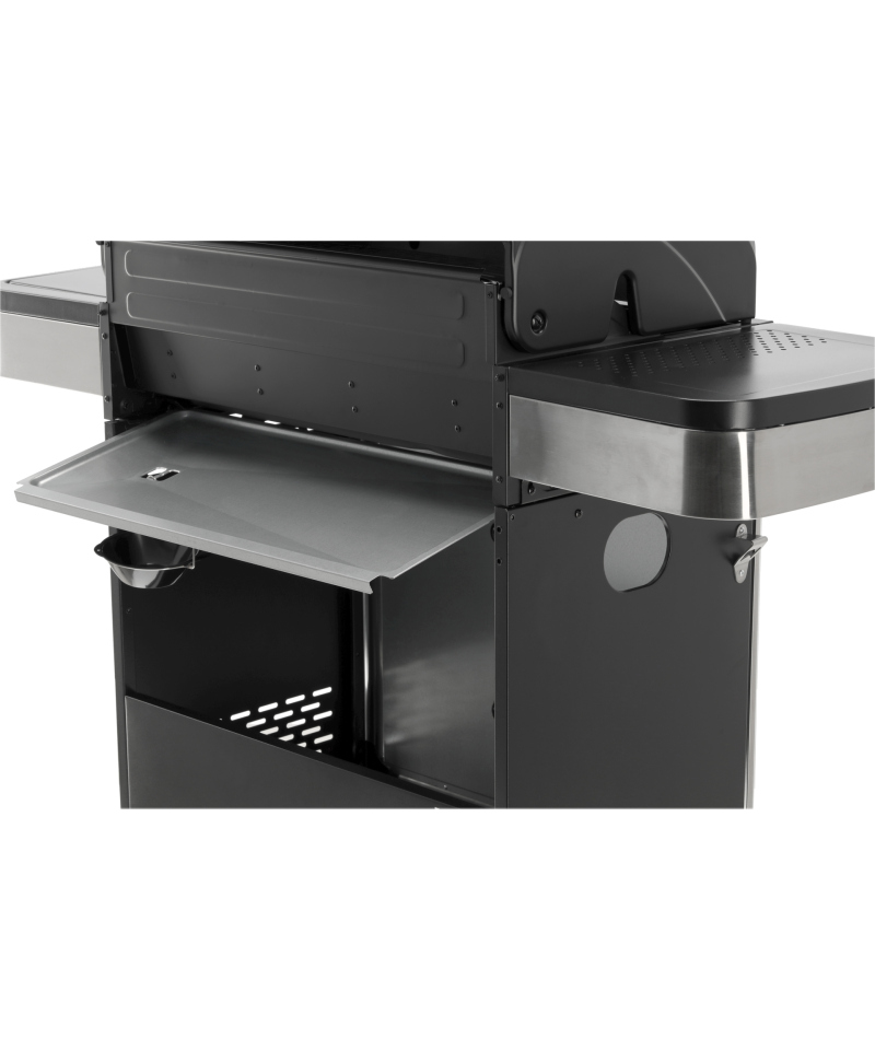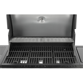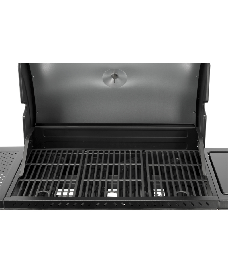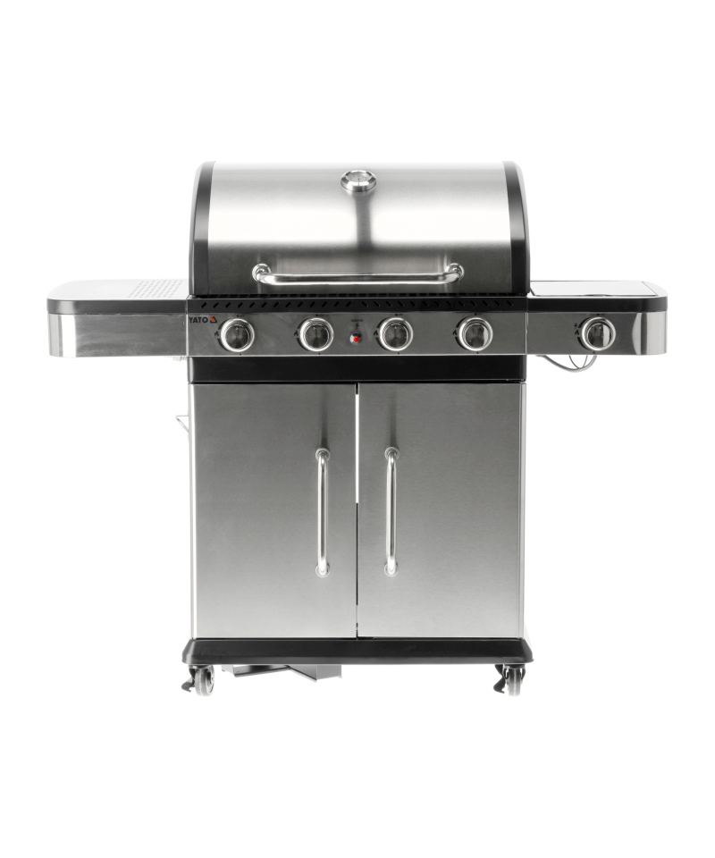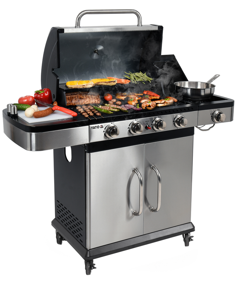 A modern 4+1 gas grill, made of high-quality stainless steel, guarantees durability and an elegant appearance. Equipped with a solid, cast iron grate, it ensures excellent grilling results. Practical side shelves and a spacious, lockable cabinet offer a convenient place to store spices and all necessary accessories.