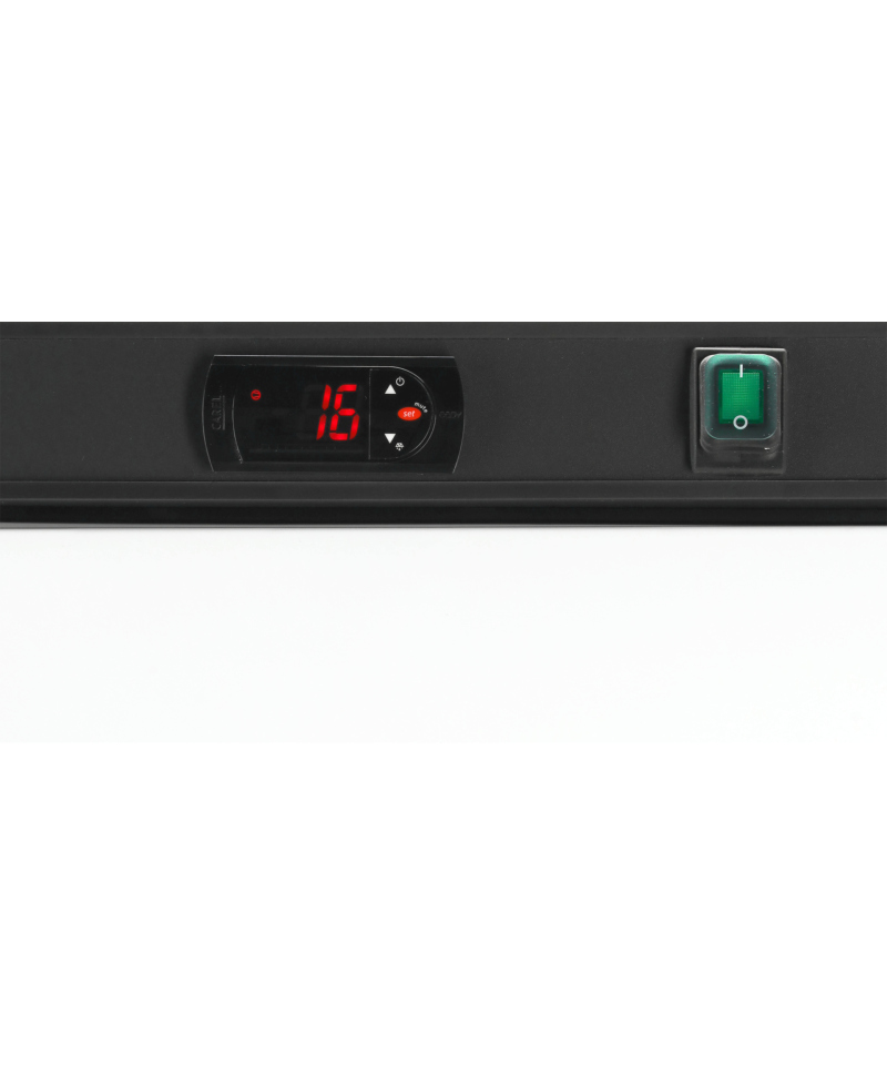 Refrigerated cabinet GN 2/1 with forced air circulation, automatic. defrosting and hot gas condensate evaporation, adjustable with digital display. Stainless steel interior. The aggregate in the form of a monoblock located on the top of the device. Central cooling with condensate drain.
