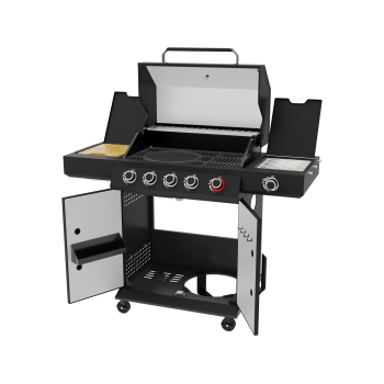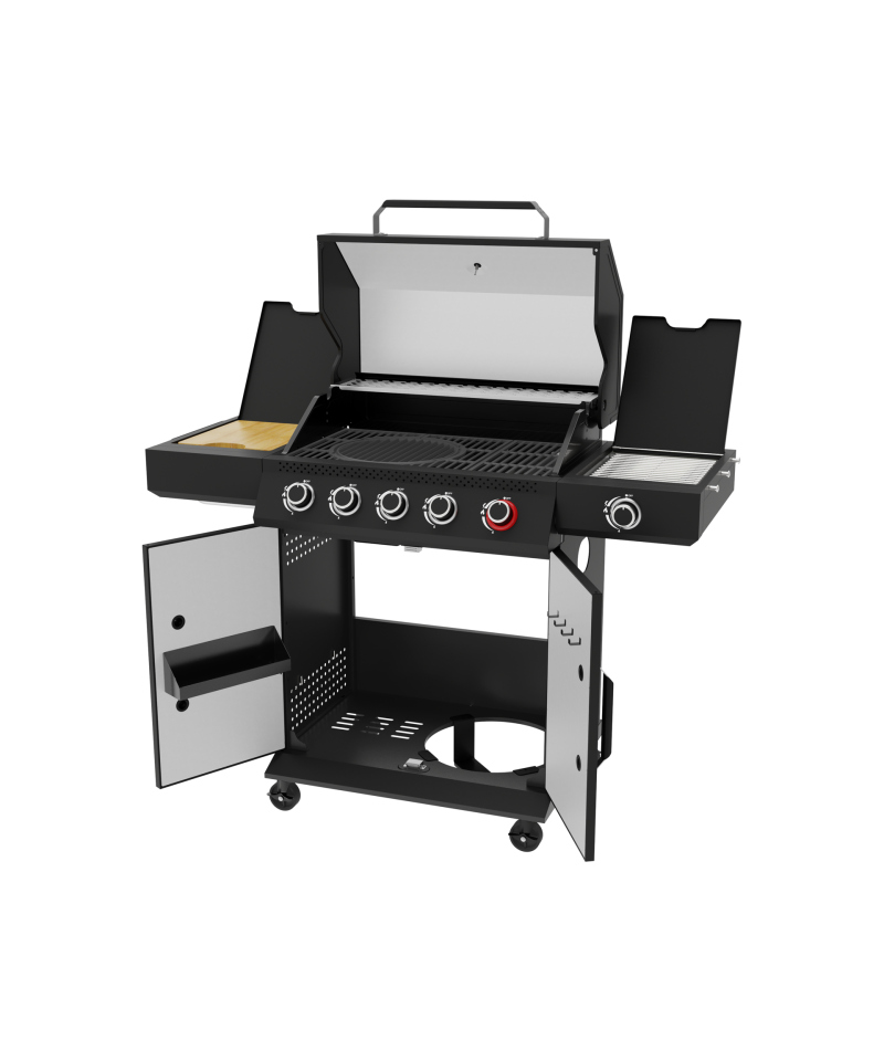 Discover the unique Yao series gas grill, standing out on the market thanks to its 6 burners with an impressive total power of 19.5 kW and practical solutions that revolutionize outdoor cooking. Four main burners, each with a power of 3 kW, guarantee even heat distribution over a large working surface, ideal for classic grilling of larger portions. The 4 kW high-power burner ensures instant heating and intense searing, perfect for more demanding dishes. Meanwhile, the side infrared burner (3.5 kW) is the key to perfect steaks – it allows you to achieve an ideally crispy crust and a juicy interior thanks to extremely high temperature. The model is equipped with a solid cast iron grate with a generous surface area and a warming rack made of high-quality stainless steel, ensuring durability, corrosion resistance, and damage protection.