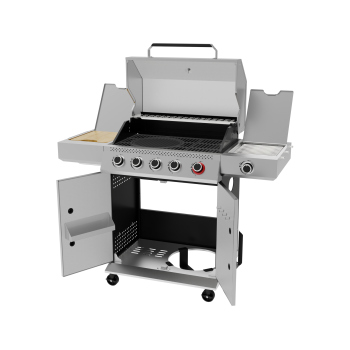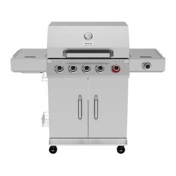 Discover **Yao series gas grill** with 6 burners and an impressive total power of 19.5 kW, designed for maximum convenience and versatility in preparing delicious outdoor meals. Four main burners (3 kW each) guarantee even heat distribution over a large working surface, ideal for classic grilling of large portions. Additionally, a high-power 4 kW burner provides instant heating and intense searing, perfect for more demanding culinary challenges. The indispensable side infrared burner (3.5 kW) is the key to perfect steaks – thanks to its extremely high temperature, it allows for an ideally crispy crust and a juicy interior. The model is equipped with a **solid cast iron grate** with a large working surface and a warming rack made of high-quality stainless steel, ensuring exceptional durability, corrosion resistance, and damage resistance. Most structural elements are made of high-grade stainless steel, emphasizing its premium character.
