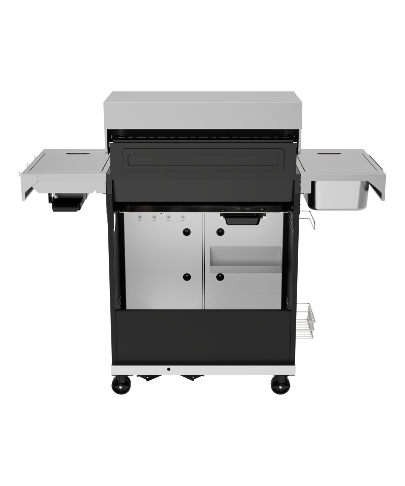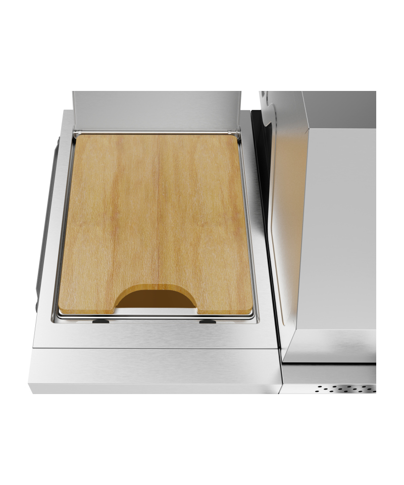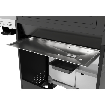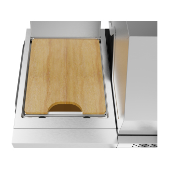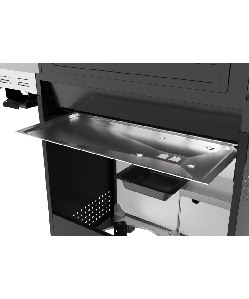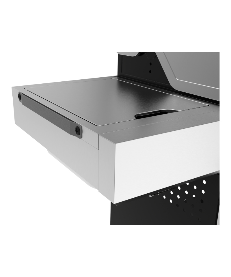 - Side shelf – Equipped with a pull-out wooden cutting board, which significantly facilitates food preparation. Additionally, a steel container (made of stainless steel) allows for convenient storage of ingredients or ready-made dishes right next to the grill. The container can be easily removed thanks to two handles. \t