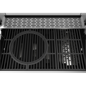 - Cast iron grate with dimensions 700 × 420 mm – Offers a spacious grilling surface, ideal for preparing meals for the whole family or a larger group. Cast iron perfectly accumulates and evenly distributes heat, which guarantees ideal browning of dishes. The grill's functionality can be extended by removing part of the grate and replacing it with optional accessories, such as a cast iron plate, cast iron pan, or pizza stone, which increases the grill's versatility. \t