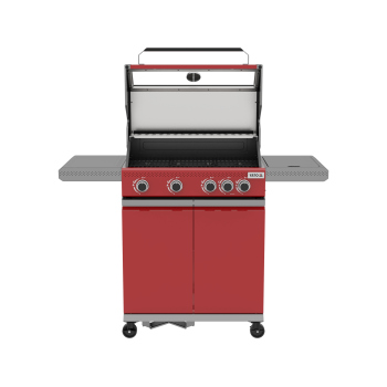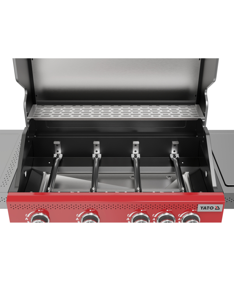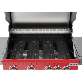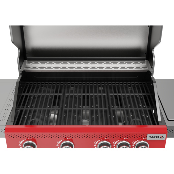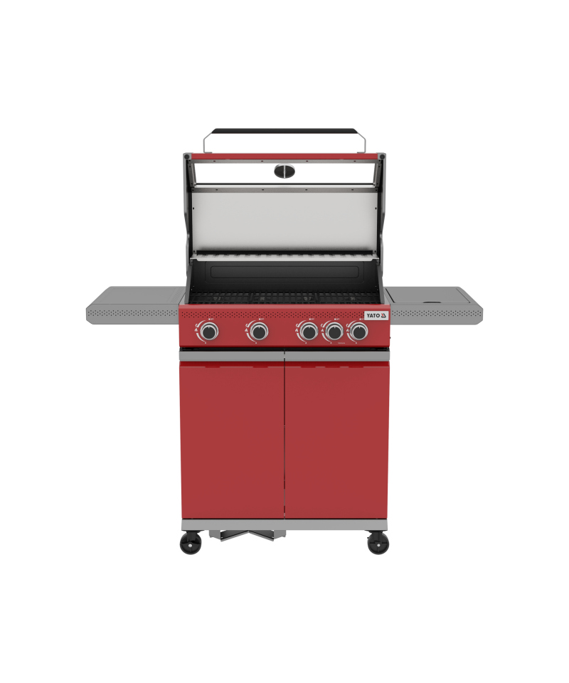 Discover modernity and style with the YATO Itami 4+1 gas grill, distinguished by its unique red and grey color scheme. At the heart of the device is a solid cast iron grate with an impressive surface area of 68 x 42 cm, complemented by a practical stainless steel warming rack. With a total burner power of 14.2 kW, the grill guarantees excellent results. Functional side shelves and a spacious, lockable cabinet provide convenient storage for spices and all necessary accessories.