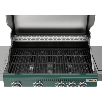 Discover modernity and functionality with the 4 + 1 gas grill from the exclusive YATO Itami series, distinguished by its unique green-grey color scheme. At the heart of the device is a reliable cast iron grate with an impressive surface area of 68 x 42 cm, complemented by a practical stainless steel warming rack. With a total burner power of 14.2 kW, the grill guarantees excellent culinary results. Thoughtfully designed side shelves and a spacious, lockable cabinet provide convenient storage for spices and all necessary accessories.