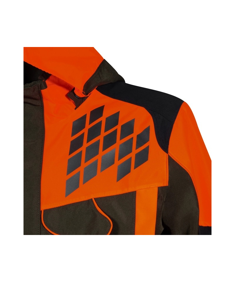 Designed for ergonomic performance, the RENK jacket ensures unrestricted movement and reliable protection. The detachable and adjustable hood with rubber inserts improves visibility, while adjustable cuffs and a flexible back panel enhance comfort during activity. Thermal seams and a double storm flap around the zipper prevent water and wind infiltration. Its resistance to tears and thorny vegetation makes it a robust and dependable garment for demanding outdoor work or hunting.