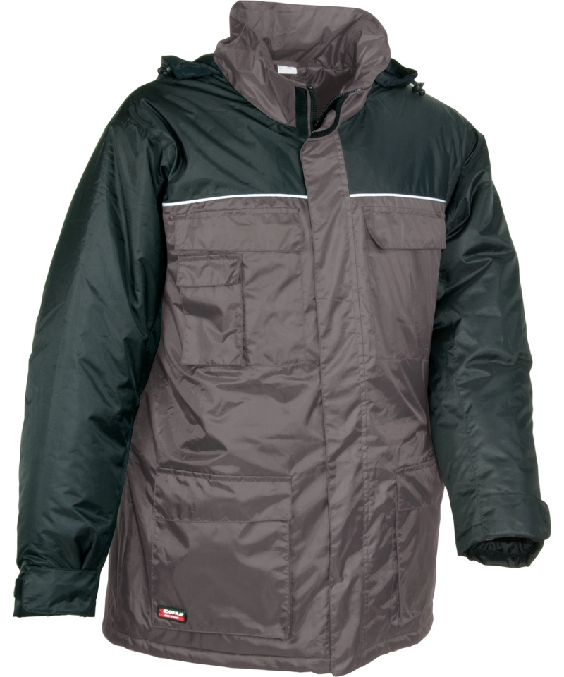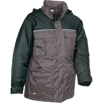 The jacket features two large double front pockets and two chest pockets with flaps, offering ample storage for essential tools and gear. An additional pocket designed for a mobile phone adds extra convenience. The GALWAY model combines functionality, durability, and protection, making it suitable for professionals in industries such as construction, logistics, and agriculture. Its warm and windproof structure makes it ideal for use in cold, windy environments.