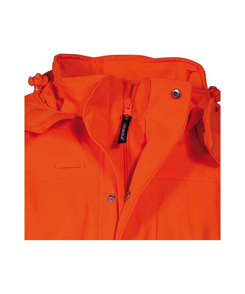 The FLUO jacket combines protection, comfort, and advanced functionality, designed for professionals who face challenging outdoor conditions. Made from durable 250 g/m² fabric with added elastane, it ensures flexibility and resistance to wear. The COFRA-TEX membrane provides outstanding waterproof and windproof performance while maintaining breathability, keeping the wearer dry and comfortable throughout the day. The polyester padding delivers excellent insulation, making the jacket suitable for cold and windy environments.
