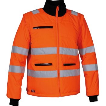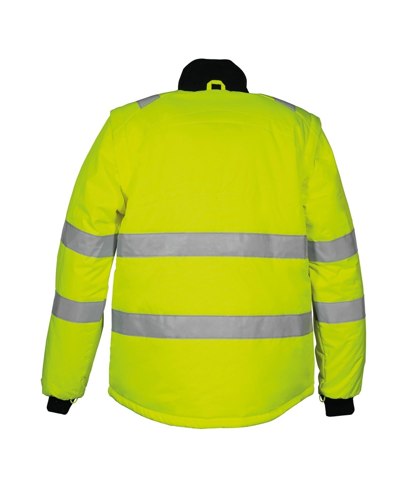 The outer jacket, made of polyester coated with polyurethane, ensures resistance to water and wind while maintaining breathability. It features thermally welded seams, an adjustable hood, multiple functional pockets, and reflective tapes for enhanced visibility. The insulated inner jacket, with a 150 g/m² padding, offers warmth and flexibility and can be worn separately thanks to its detachable sleeves. Both layers are designed with reflective inserts to provide optimal visibility even in low-light environments.
