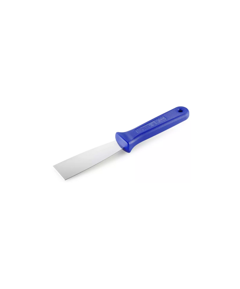 The blade is made of high-quality stainless steel with a thickness of 0.5 mm, ensuring precision and long-term durability. The ergonomic polypropylene (PP) handle in blue features a textured surface for a secure and comfortable grip during use.