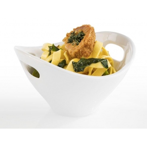 A bowl made of white melamine. Dishwasher safe, refrigerated and stackable. Withstands temperatures from -30 to +70 degrees Celsius.
