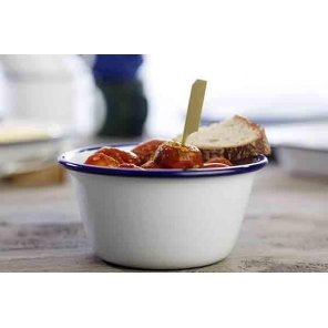 A small round vessel made of white melamine imitating porcelain. Especially recommended for serving dips