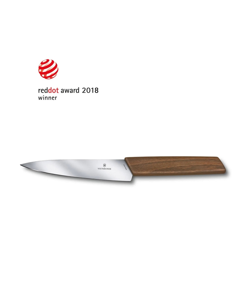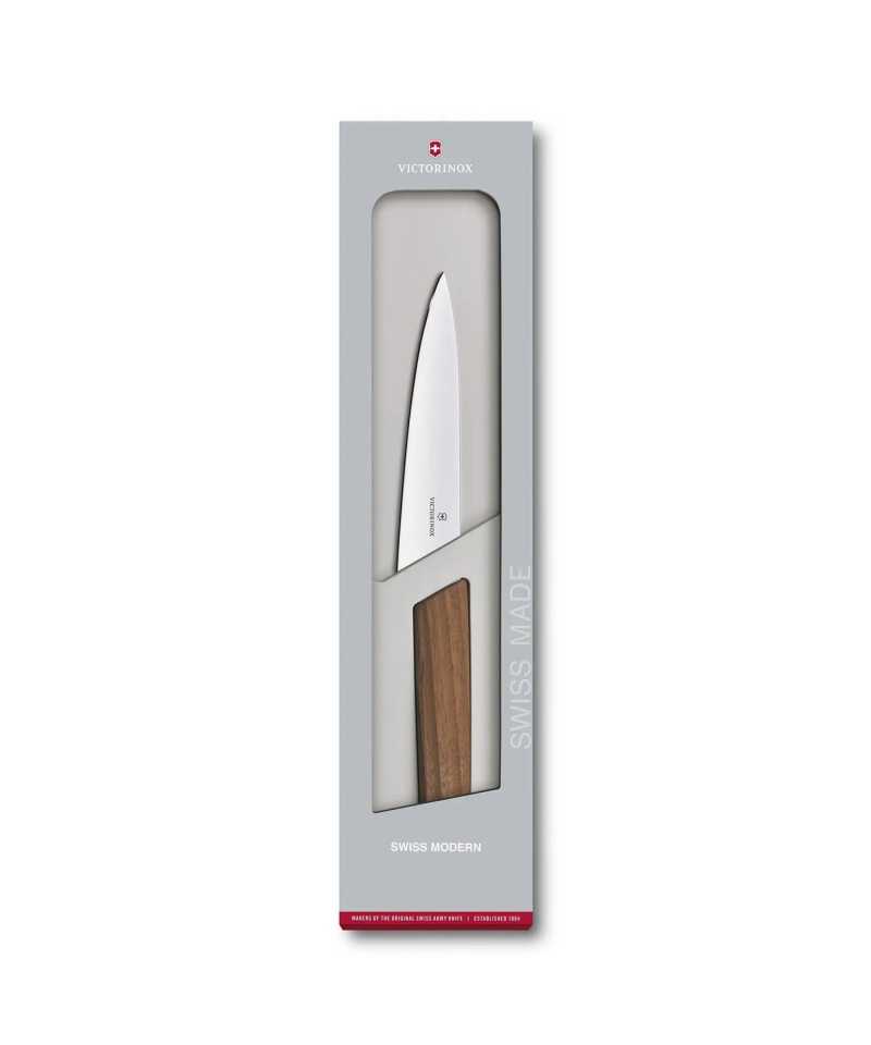 Nóż kuchenny idealny do domowych zastosowań, posiada zaostrzony czubek i rękojeść o ergonomicznym kształcie, wykonaną z europejskiego drzewa orzechowego o wąskich słojach. Świetni sprawdzi się przy obieraniu lub przy wydrążaniu owoców lub warzyw, jest to przyjaciel każdego kucharza. Solidnie wykonany, piękny i ponadczasowy przyrząd kuchenny łączy elegancję z najwyższą funkcjonalnością. Noże Swiss Modern nie tylko płynnie kroją każdy rodzaj jedzenia ale pasują do wnętrza każdej współczesnej kuchni.