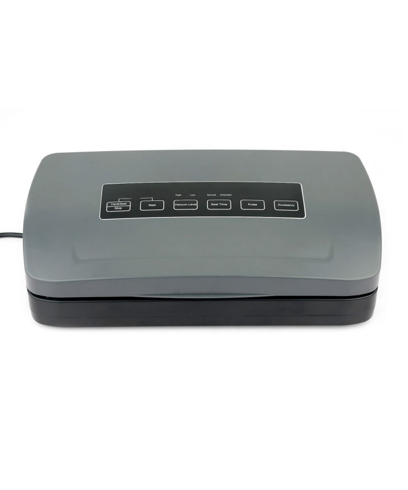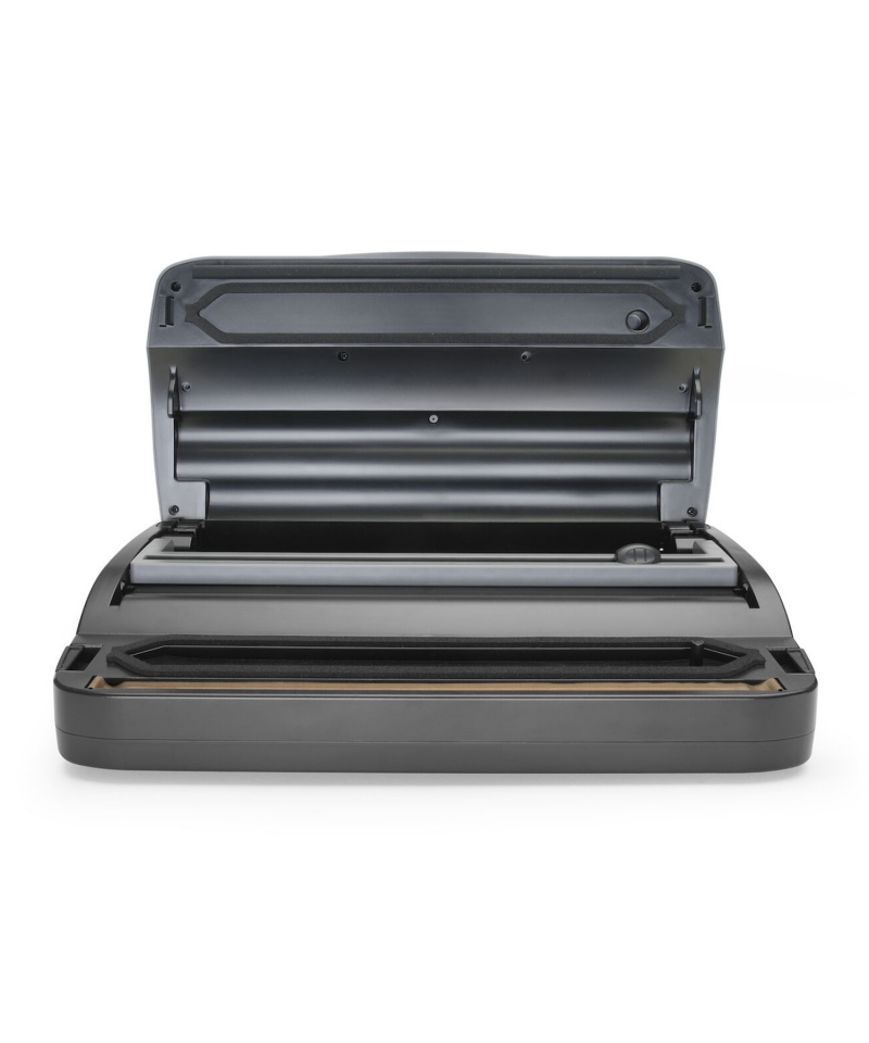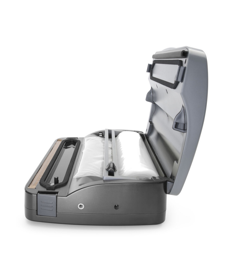 Urządzenie oferuje dwa poziomy mocy zasysania oraz dwa czasy zgrzewania, co pozwala dopasować ustawienia do rodzaju produktu – od delikatnych ziół po twardsze mięso. Uszczelka pokrywy zapewnia pełną szczelność, a wbudowany zasobnik na worki umożliwia wygodną i szybką pracę. Pakowarka chłodzona powietrzem działa stabilnie, choć nie jest przeznaczona do pracy ciągłej. Do użytku wyłącznie z workami moletowanymi.