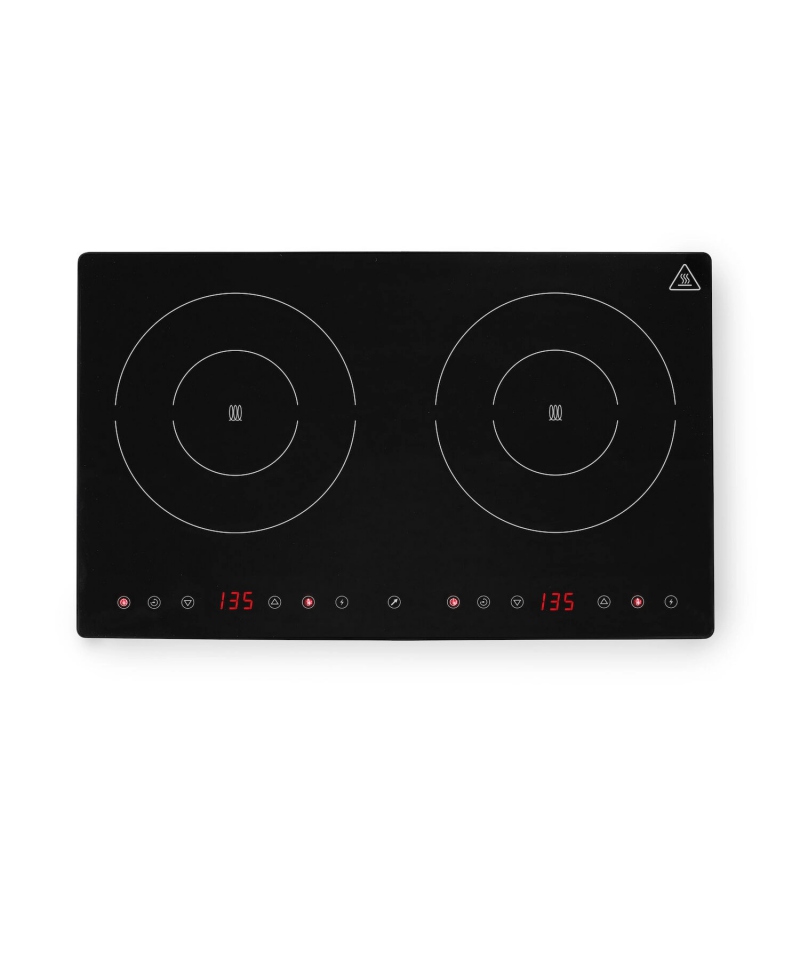 Urządzenie wyposażone jest w szklaną powierzchnię ceramiczną z wbudowanym cyfrowym wyświetlaczem i dotykowym panelem sterowania. Kuchenka indukcyjna podwójna oferuje 9 poziomów mocy i temperatury, co umożliwia precyzyjne dopasowanie parametrów do różnorodnych potraw. Zakres temperatur od 35°C do 240°C oraz timer (0–180 minut) zapewniają pełną kontrolę nad procesem gotowania.