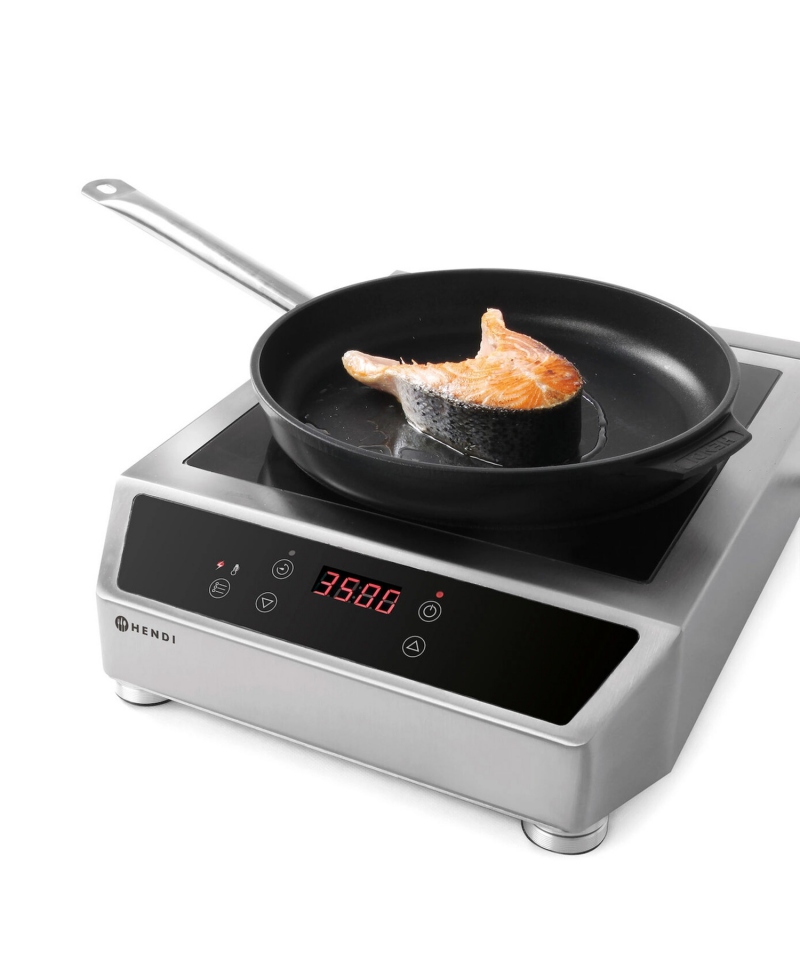W technologii indukcyjnej ciepło powstaje bezpośrednio w naczyniu, co minimalizuje straty energii i podnosi poziom bezpieczeństwa – powierzchnia robocza wokół pola grzejnego pozostaje chłodna. Kuchenka indukcyjna Hendi charakteryzuje się też łatwością czyszczenia, co ma kluczowe znaczenie w intensywnie użytkowanych kuchniach.