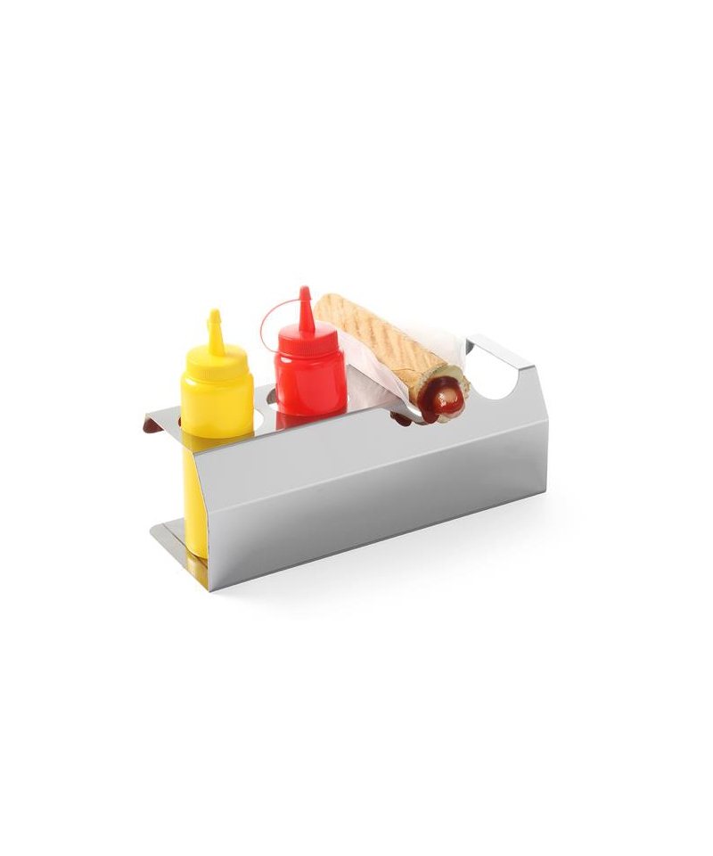 Ekspozytor do hot-dogów i dyspenserów marki HENDI to solidnie wykonane akcesorium ze stali nierdzewnej 18/0, przeznaczone do profesjonalnej gastronomii. Idealnie sprawdzi się w punktach sprzedaży hot-dogów, bufetach i food truckach. Wyposażony w 2 otwory na dyspensery HENDI oraz 2 miejsca na hot-dogi, ułatwia estetyczną prezentację produktów i usprawnia pracę personelu. Produkt nadaje się do mycia w zmywarce.