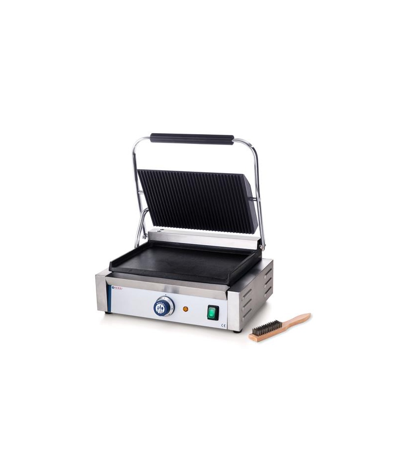 Profesjonalny grill kontaktowy z płytami ryflowanymi, wykonanymi ze szkła ceramicznego.