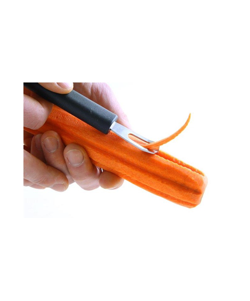 Ostrze wykonane ze stali nierdzewnej zapewnia trwałość, odporność na korozję oraz precyzyjne cięcie. Specjalna konstrukcja kanałowa umożliwia tworzenie dekoracyjnych rowków i wzorów, szczególnie w cytrusach i warzywach. Ergonomiczna rękojeść z polipropylenu gwarantuje pewny chwyt i komfort pracy, a otwór do zawieszenia ułatwia przechowywanie.