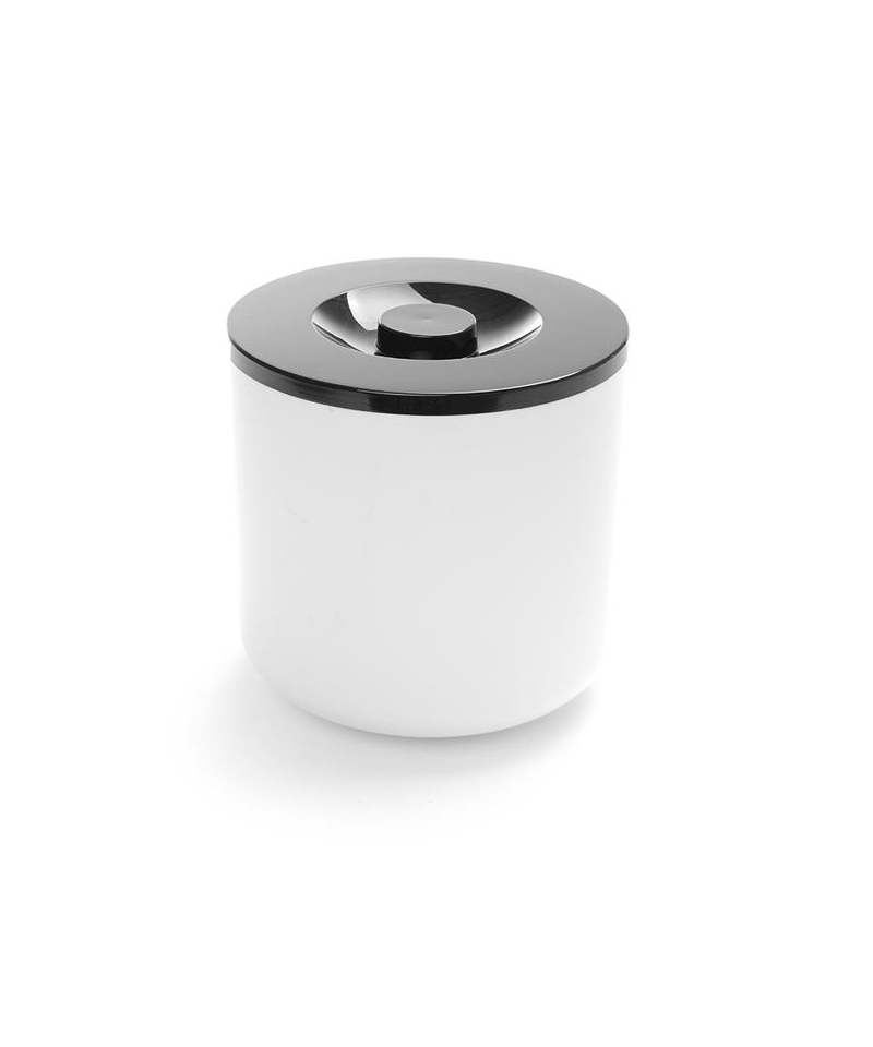- Elegancki biały pojemnik, z czarna pokrywka do przechowywania kostek lodu bezpośrednio na blacie baru lub blacie stołu konsumenckiego