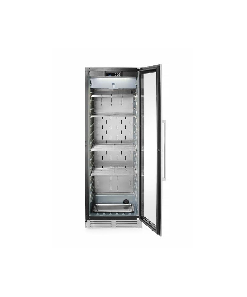Drzwi z podwójnego szkła hartowanego niskoemisyjnego chronią przed stratą energii i przenikaniem promieni UV, co sprzyja energooszczędności i bezpieczeństwu przechowywanego mięsa. Lampa UVC zapewnia sterylność, eliminując bakterie i niepożądane drobnoustroje. Wnętrze oraz akcesoria, takie jak półki, haki i tacka na sól, wykonane są z wysokiej jakości stali nierdzewnej 18/8, co ułatwia czyszczenie i gwarantuje trwałość. Oświetlenie LED po bokach i na suficie zapewnia doskonałą widoczność, a alarmy informują o niskiej wilgotności lub otwartych drzwiach. To zaawansowane technologicznie urządzenie pozwala na dojrzewanie mięsa w warunkach w pełni kontrolowanych i bezpiecznych, co przekłada się na wyjątkowy smak i teksturę.