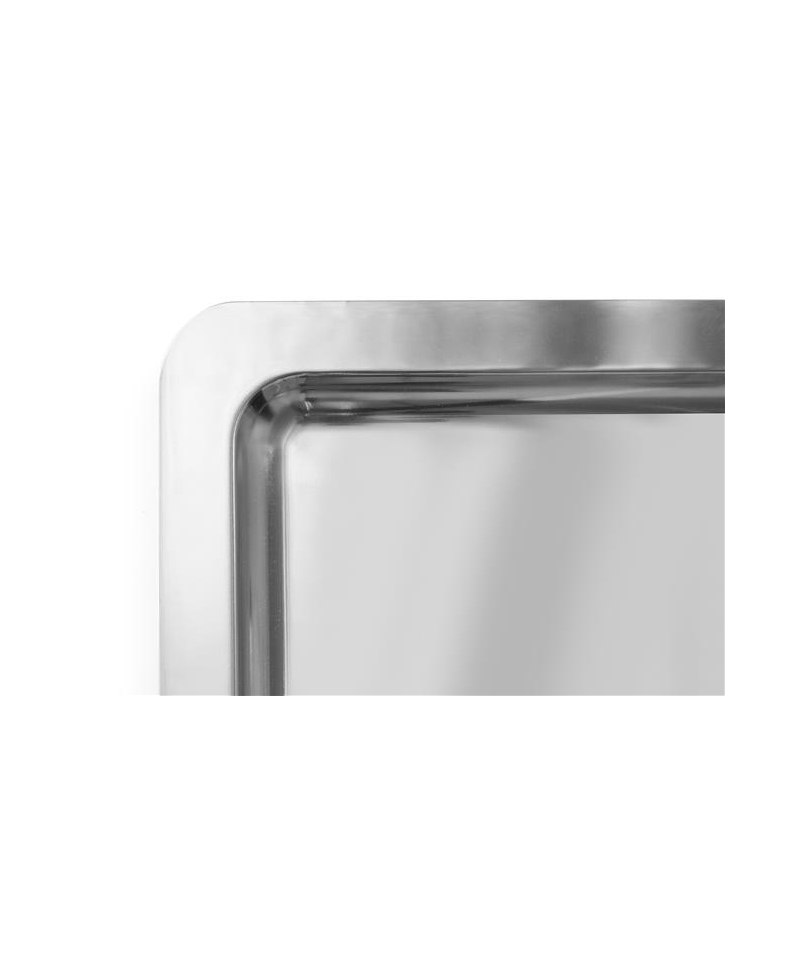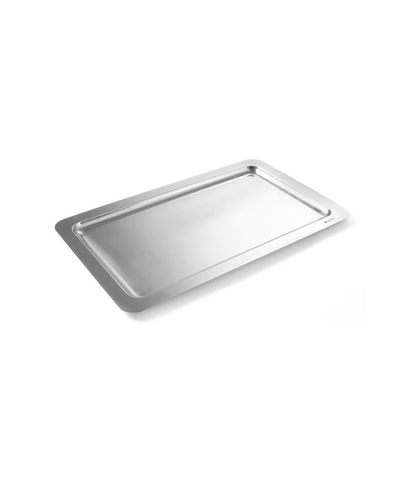 Taca z wywiniętym, dekoracyjnym rantem, wykonana ze stali chromowanej nieodpornej na działanie kwasów, olejów, sosów itp. Potrawy należy podawać z podłożoną na tacy papierową serwetką. Tacy nie należy myć w zmywarce. Można sztaplować.