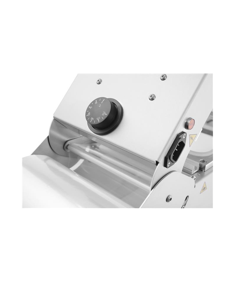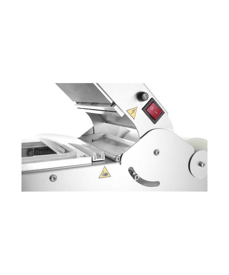 - Automatycznie wysuwana gilotyna z bezpiecznym nożem w specjalnie zaprojektowanej osłonie - cięcie odbywa się tuż za zgrzewanym pojemnikiem w specjalnej listwie (technologia air-cut)