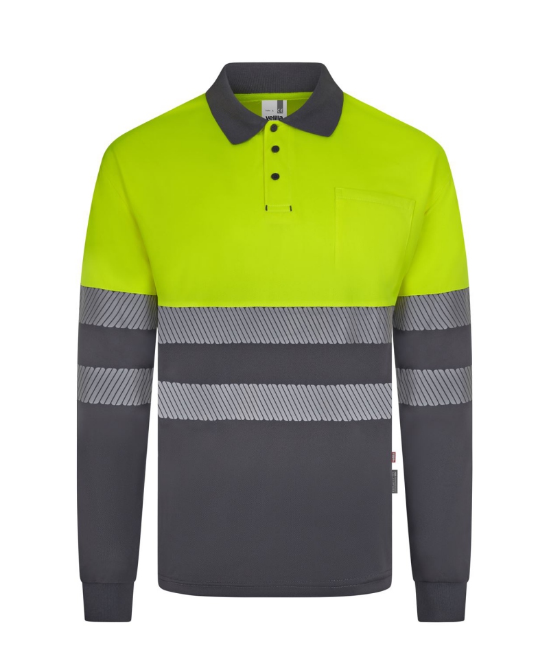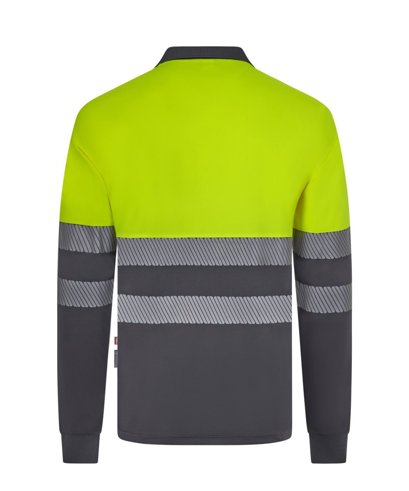 Funkcjonalna i widoczna – dwukolorowa koszulka polo z długim rękawem z recyklingowanego poliestru, z segmentowaną taśmą odblaskową. Idealna do pracy w trudnych warunkach i o ograniczonej widoczności.