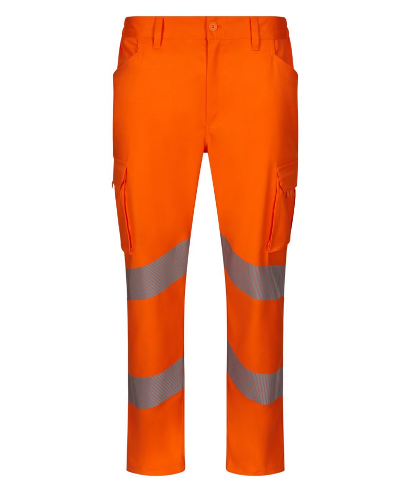 Trwałe i funkcjonalne spodnie robocze z sześcioma kieszeniami, pasem elastycznym i certyfikatem EN 20471 klasa 2 – idealne do pracy w trudnych warunkach.