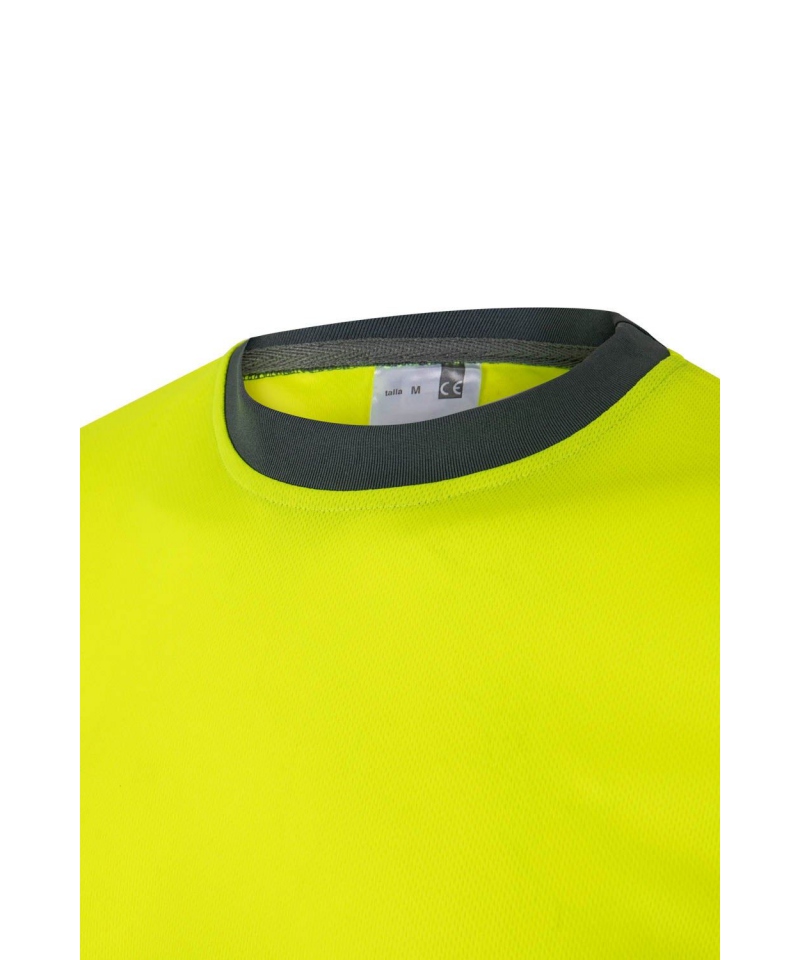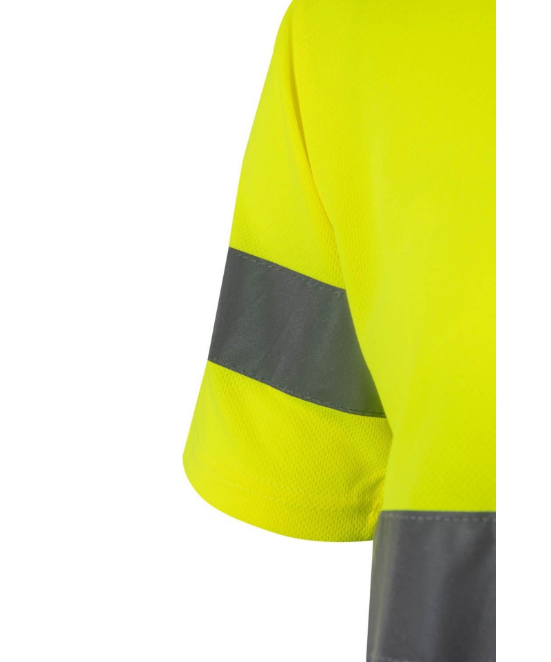 Dwukolorowa techniczna koszulka ostrzegawcza z krótkim rękawem, wykonana z lekkiego poliestru Bird-Eye (140 gsm). Wyposażona w taśmę odblaskową na rękawach i tułowiu, kontrastowy dekolt oraz wzmocnienie na karku w jodełkę. Certyfikat EN 20471 (klasa 1).