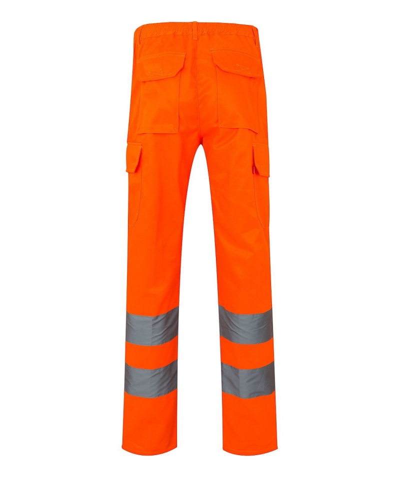 Model ten wykonany jest z mieszanki materiałów: tkanina pomarańczowa to połączenie 60% bawełny i 40% poliestru, natomiast żółta – 80% poliestru i 20% bawełny. Dzięki temu spodnie są trwałe, dobrze znoszą wielokrotne pranie, a jednocześnie pozwalają skórze oddychać. Taśmy odblaskowe umieszczone na dolnej części nogawek gwarantują bardzo dobrą widoczność użytkownika niezależnie od warunków pogodowych czy pory dnia.