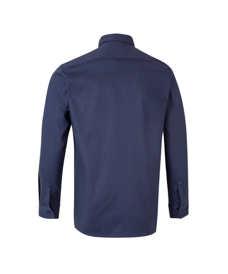 Na piersi znajdują się dwie naszywane kieszenie zapinane na guziki i patki, które oferują praktyczne miejsce do przechowywania podręcznych drobiazgów lub przyborów. Dostępna w kolorze morskim, w szerokim zakresie rozmiarów od S do 3XL, koszula łączy w sobie funkcjonalność z klasycznym stylem roboczym.