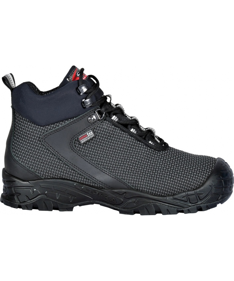 Cholewka wykonana z innowacyjnego materiału TECHSHELL łączy lekkość z wyjątkową odpornością na ścieranie, wodę i uszkodzenia mechaniczne. Wewnątrz znajduje się membrana COFRA-TEX WATERPROOF UNIVERSAL w formie skarpetki, która całkowicie otula stopę i zapewnia pełną barierę przed wilgocią. Elastyczna podszewka LYCRA® poprawia komfort i dopasowanie. Całość dopełnia oddychająca i anatomiczna wkładka EVANIT, wykonana z mieszanki EVA i nitrylu, zapewniająca antystatyczność oraz wyjątkową wygodę.