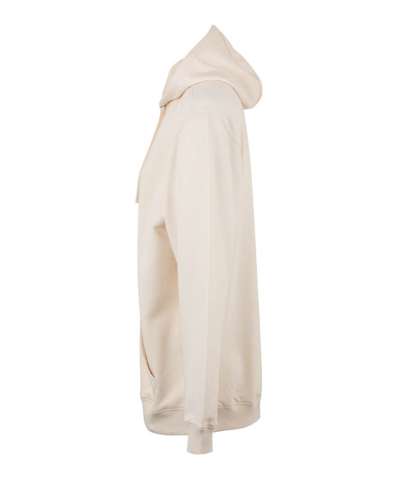 Kieszenie typu kangurka zapewniają miejsce na dłonie lub drobiazgi, a delikatne wykończenie oraz wzmocnione szwy świadczą o solidności wykonania. Pas i mankiety wykonano z dzianiny 2x1 z dodatkiem elastanu, co zapobiega rozciąganiu i zniekształceniom nawet po wielu praniach. Wewnętrzna taśma wzmacniająca w jodełkę na karku dodatkowo zwiększa trwałość bluzy.