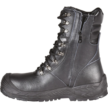 Model BRAGI S3S CI HRO SC FO SR z linii BELOW ZERO to obuwie ochronne zaprojektowane specjalnie do pracy w wymagających warunkach zimowych. Cholewka wykonana została z hydrofobowej skóry z nadrukiem, która skutecznie chroni przed wilgocią i jednocześnie zachowuje wysoką oddychalność. Wnętrze obuwia wypełnia ekologiczne futro połączone z ociepleniem THINSULATE™ 200 g, które gwarantuje stabilny komfort cieplny nawet przy bardzo niskich temperaturach. Zewnętrzna podszewka z oddychającego materiału dodatkowo podnosi wygodę użytkowania, a wewnętrzny zamek błyskawiczny umożliwia szybkie zakładanie i zdejmowanie obuwia.
