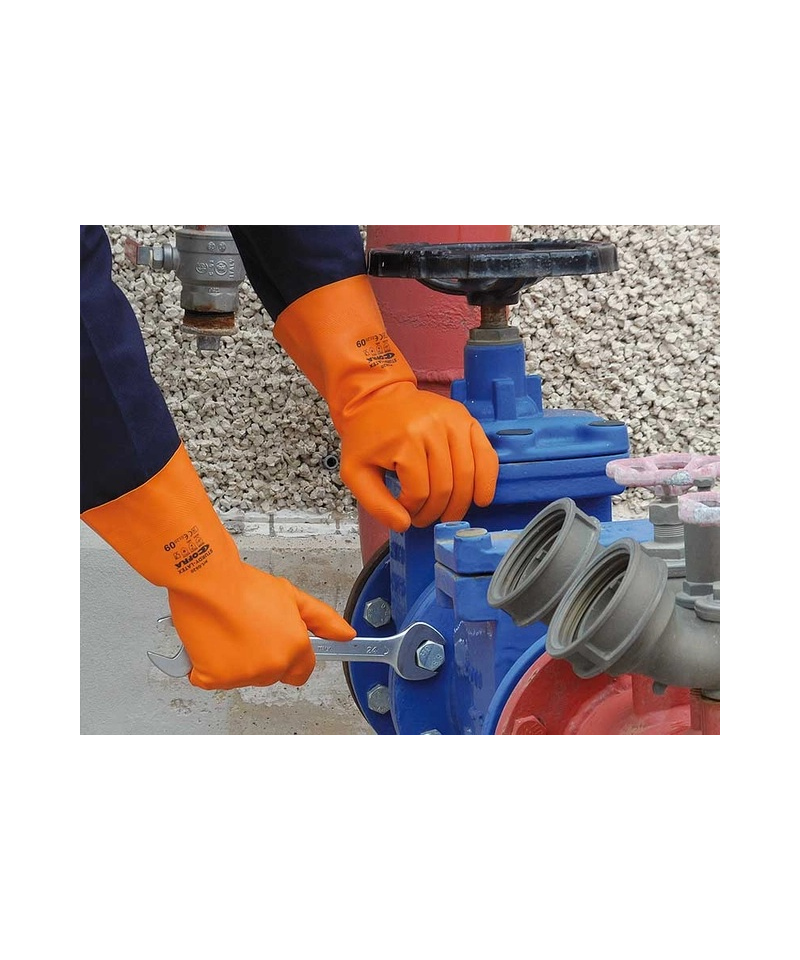Wodoodporne rękawice lateksowe. Odpowiednie do długotrwałej pracy, dzięki komfortowemu wkładowi tekstylnemu i dobrej izolacji termicznej.