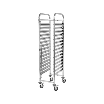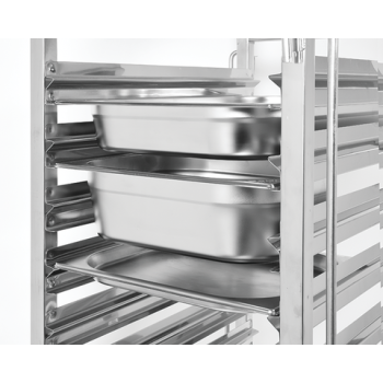 Konstrukcja wózka opiera się na wysokiej jakości stali nierdzewnej typu 201, co zapewnia mu nie tylko wyjątkową odporność na korozję, ale także długotrwałe walory użytkowe i bezproblemowe utrzymanie higieny. Solidna budowa z profili o grubości 0,9 mm gwarantuje niezrównaną stabilność, a każda z półek jest w stanie udźwignąć obciążenie do 40 kg. Innowacyjne prowadnice, rozmieszczone co 80 mm i posiadające specjalną konstrukcję w kształcie litery M, pewnie utrzymują pojemniki GN na miejscu. Ten unikalny profil umożliwia również dodatkowe dostosowanie odległości między poziomami o 20 mm, zwiększając elastyczność użytkowania. Dodatkowo, po obu stronach wózka zintegrowano specjalne, intuicyjne w obsłudze blokady, które skutecznie zabezpieczają pojemniki przed przypadkowym wysunięciem podczas przemieszczania.