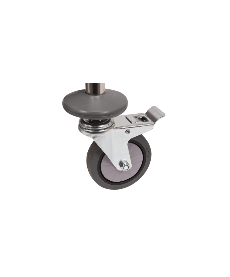 Dla maksymalnej mobilności, wózek wyposażono w 4 wysokiej jakości kółka z łożyskami, wykonane z wytrzymałego szarego materiału TPR. Połączenie twardości z elastycznością tego materiału gwarantuje wyjątkowo cichą pracę, a co najważniejsze – kółka nie rysują posadzek, nie pozostawiają na nich żadnych śladów i swobodnie obracają się o 360°. Ta cecha znacząco ułatwia precyzyjne manewrowanie nawet w ciasnych pomieszczeniach i wąskich korytarzach. Dodatkowo, dla zwiększenia bezpieczeństwa, dwa z kółek zostały wyposażone w niezawodne hamulce.