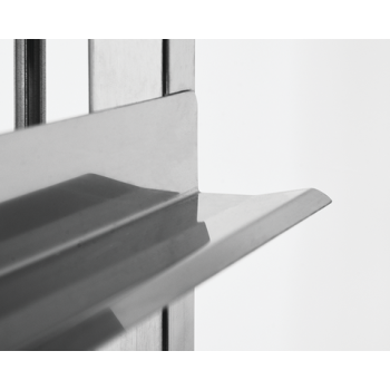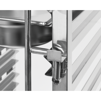 Prowadnice, rozmieszczone co 80 mm i wyróżniające się specjalną konstrukcją w kształcie litery L, zapewniają bezpieczne i stabilne pozycjonowanie tac oraz blach, maksymalizując dostępną powierzchnię dla transportowanych produktów. Dodatkowo, po obu stronach wózka umieszczono praktyczne i łatwe w obsłudze blokady, które skutecznie zabezpieczają pojemniki przed przypadkowym wysunięciem w trakcie przewozu.
